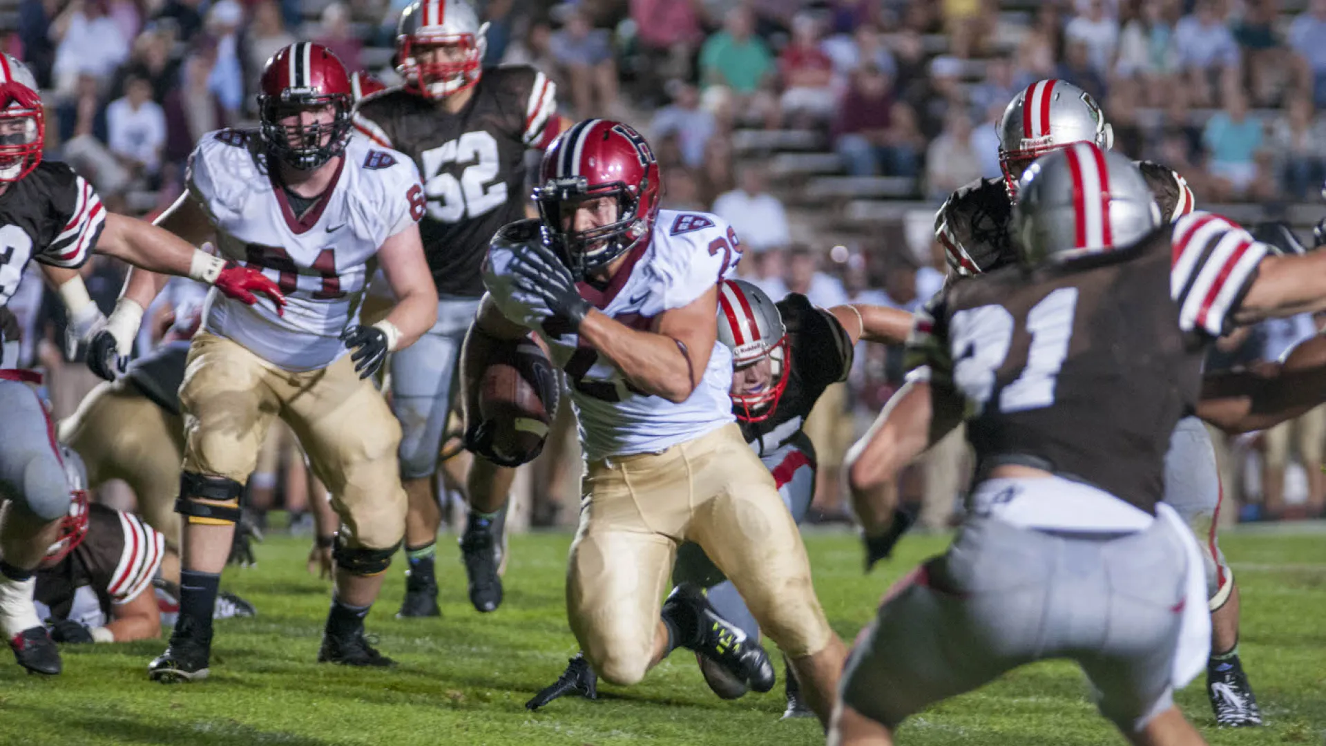 Hosch was not done. Neither was Fischer. On the Crimson’s final drive—87 yards that chewed up 4:37—the duo hooked up five times, with Fischer deftly working the Brown flanks. (They were helped when Fischer suffered a helmet-to-helmet hit that cost Brown 15 yards.) With third-and-goal from the Brown three, Hosch faked a pitch and ran it in himself. Then Flesher missed yet another kick. The eight-point margin left the game in doubt until defensive back Chris Evans ’16 salted it away with an interception.