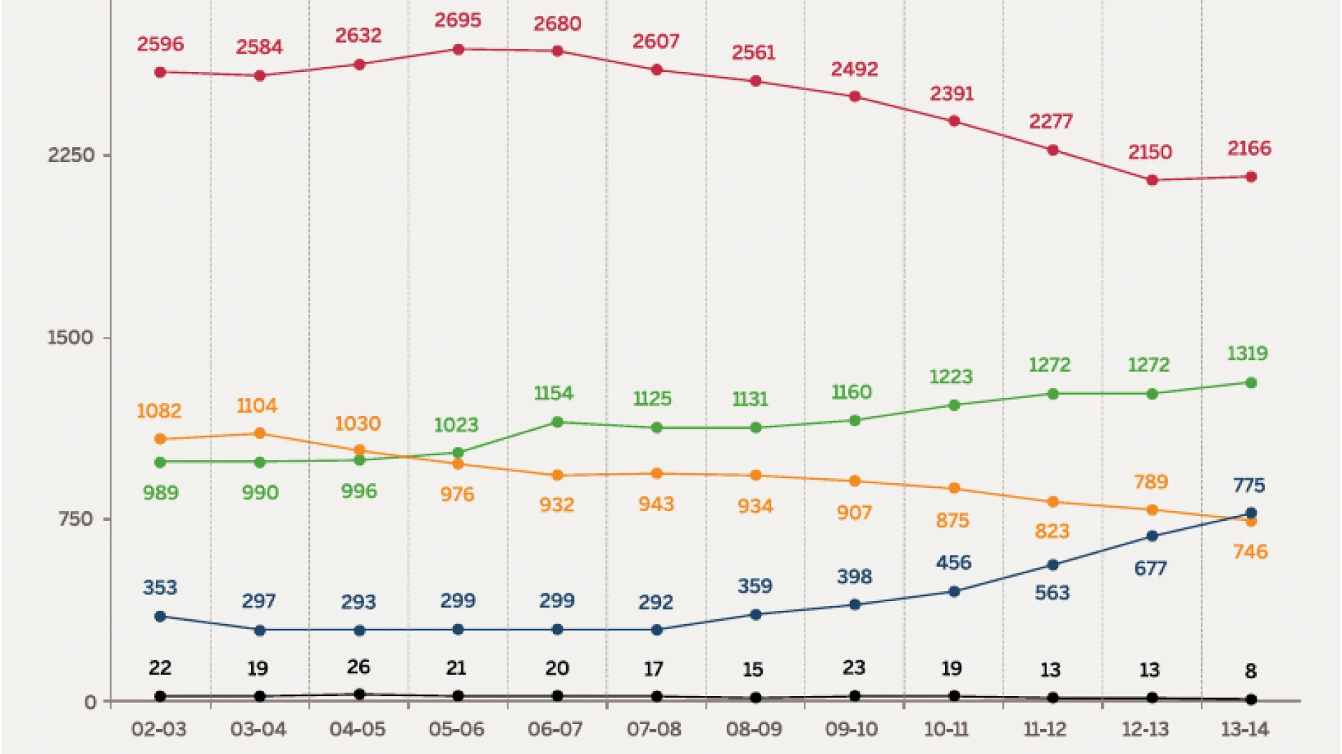 The undergraduate concentrations, shown in the exhibit above, vividly demonstrate the broad shift in student interest. From a recent peak of 1,104 arts and humanities concentrators in the 2003-2004 academic year, the ranks decreased by nearly one-third during the ensuing decade. (See “Addressing a Decline in Humanities Enrollment” for context on the phenomenon, locally and nationally.) Social-sciences concentrators peaked at 2,695 in 2005-2006, and have decreased by about 19 percent.