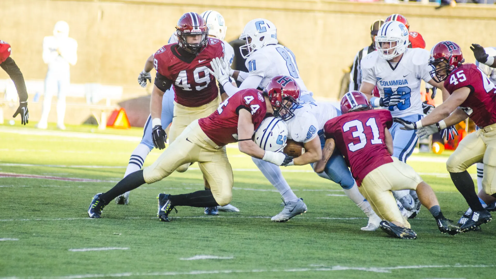 The victory on a sunny and cold (46 degrees at kickoff) afternoon was the Crimson’s twelfth straight across two seasons, while the loss was the nineteenth in a row for Columbia (0-8, 0-5 in Ivy play in 2014). Harvard (8-0, 5-0) remained one game ahead of Dartmouth, Princeton, and Yale, each of which is 4-1 in the league. This shutout was Harvard’s third straight over Columbia; the Crimson tamed the Lions 69-0 in 2012 and 34-0 in 2013. (For us non-math concentrators, that’s 148-0 in three seasons.) Harvard has permitted foes a microscopic 9.4 points a game and leads the Football Championship Subdivision (FCS) in scoring defense.