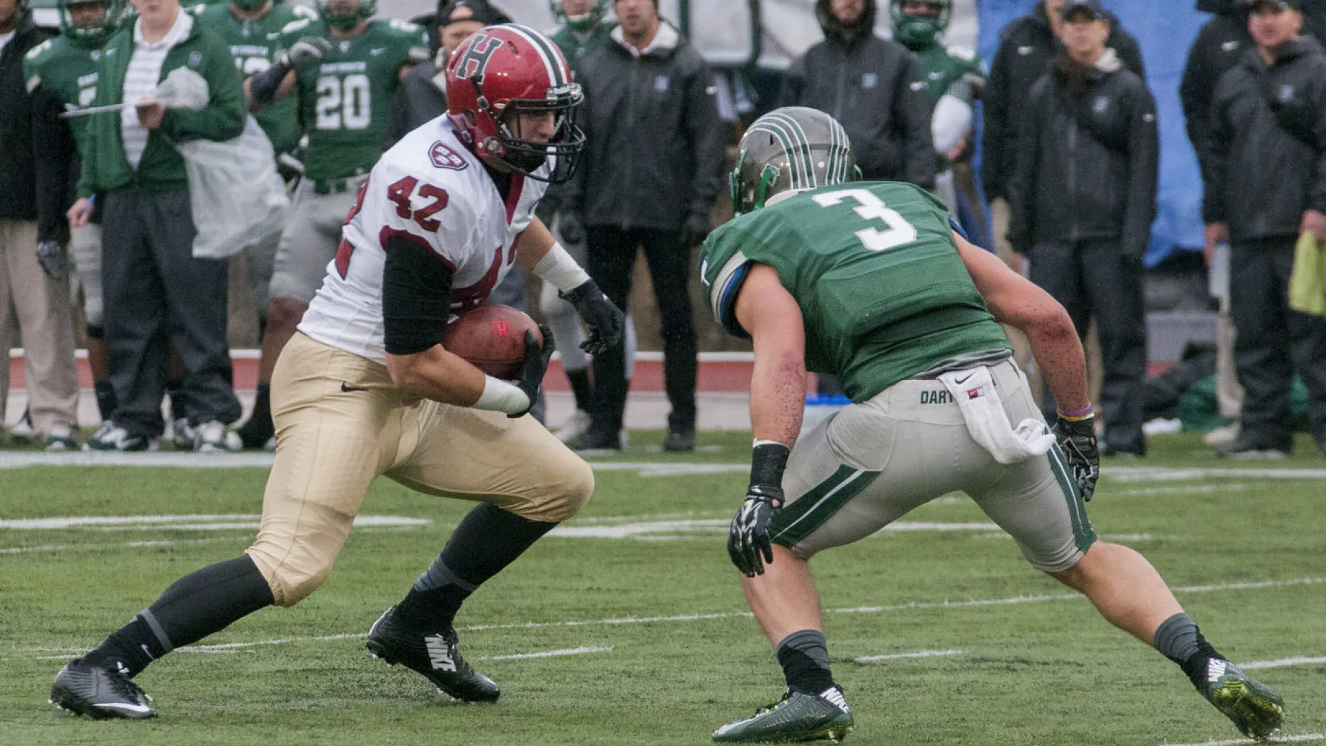 Meet the twenty-first-century model. His name is Paul Stanton Jr. The junior from Kenner, Louisiana, is, like Wendell, on the smallish side (5-foot-9, 190 pounds). Stanton also is a back for all seasons. He proved that on Saturday in wet, frigid Hanover, New Hampshire. Cutting and driving for a career-high 180 yards on 24 carries, catching three passes for 55 yards, and scoring two touchdowns, he was the essential element in Harvard’s 23-12 victory over Dartmouth. The win in the showdown between two unbeatens put the Crimson, as the expression goes, firmly in the driver’s seat in the Ivy race. Harvard now stands at 7-0 overall and 4-0 in league play—one game ahead of Dartmouth, Princeton, and Yale. The victory, which followed a 49-7 blowout at Princeton and thus happily closed out a defining two-game road trip, was the Crimson’s tenth in a row spanning two seasons. It also was coach Tim Murphy’s 101st in Ivy play, vaulting him ahead of Bob Blackman. This was poetic justice, given how the Hall of Fame Dartmouth and Cornell coach tormented the Crimson in the 1950s, ’60s, and ’70s.