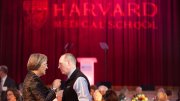 The evening gala celebration and dinner had begun with informal student presentations focused on the school’s priorities. Sim-man, a dummy experiencing symptoms of distress such as elevated heart rate (who apparently needed an intubation), exemplified changes in modern medical education (first-year students begin working with “him” in their very first week). And a presentation on mobile medical delivery in local Boston neighborhoods (familyvan.org) that featured audio interviews (produced by second-year medical student Zoe Bouchelle) with the program’s diverse clientele exemplified the school’s commitment to health equity. The night ended with a musical performance by a former student, and a reminder that in some cultures, music and medicine have been linked by their power to heal. Playing beautifully enough to prove the point, the Longwood Symphony Orchestra performed two Brahms works for piano, accompanied by the “Harvard Trio”: Richard Kogan ’77, M.D. ’81, Lynn Chang ’75, and Yo-Yo Ma ’76, D.Mus. ’91. The peace that settled over their audience was a palpable reminder of the diverse ways an institution devoted to healing goes about its business.