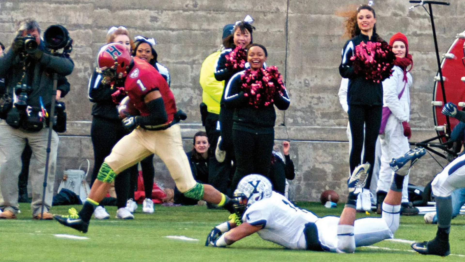 Slate-gray skies and trepidation shrouded the home side of Harvard Stadium late in the afternoon of Saturday, November 22. In the big picture, the anxiety seemed unwarranted. The Crimson football team already had clinched a share of the 2014 Ivy title. It had not lost all season. Yet despite the 39-degree chill, Harvard supporters among the sellout crowd of 31,062 were perspiring through their coats of cashmere, raccoon, and down. Yale, which had entered the 131st renewal of this ancient rivalry one game behind the Crimson in the Ivy standings, had pluckily rallied from a 17-point, fourth-quarter deficit to forge a 24-24 tie with 3:55 left. Harvard’s perfect season, the outright title, the prolongation of braggin’ rights…all were about to vanish, to be replaced by a winter spent gloomily pondering where this collapse ranked among all-time Crimson catastrophes.