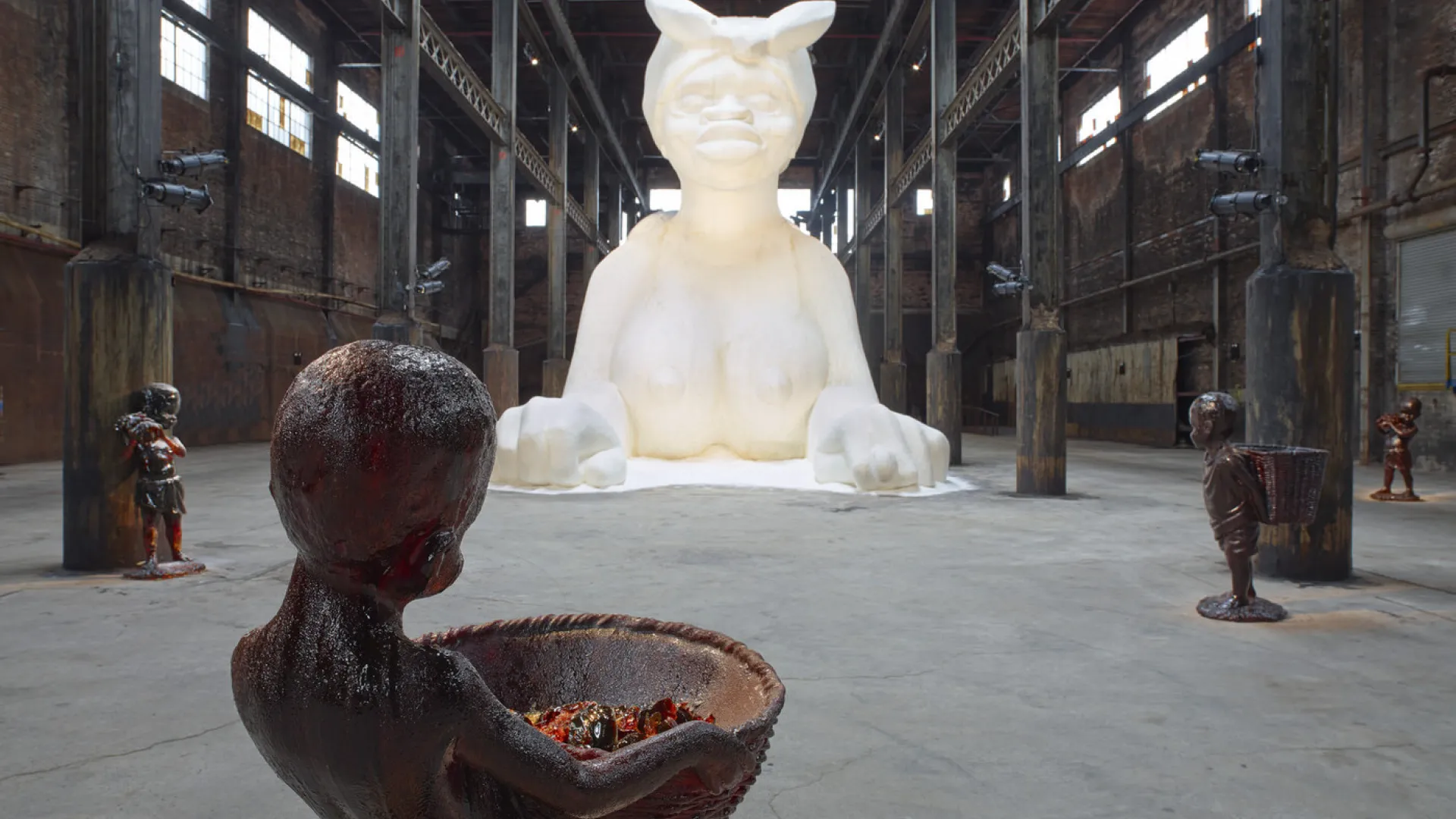 “I was realizing that I would never have this piece again,” she said. For the final hours of the installation, Walker brought video crews to the factory and instructed them to focus on black families’ encounters with the art: “It’s kind of simple, but it’s something you never see.” Then, in the last five minutes, she invited viewers to touch the sculptures. Some of the sugar on the sphinx was sloughed off. A child’s hand came away from a resin statue, sticky with amber honey.