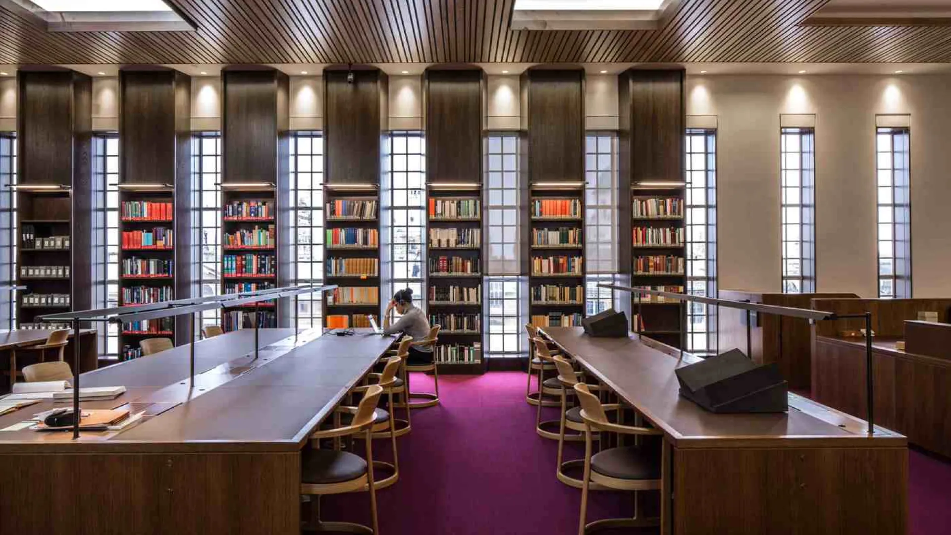 There is a notable division between public and research spaces in the library, for understandable reasons of security; and, as in most rare-books libraries, there is a further division between the space occupied by researchers and the space accessed by staff. But the variety and scale of different kinds of contact with materials—only some of them books—offered visitors is especially noteworthy in the new Weston Library: not just reader-book contact, but the dramatic display of heritage items in low-light public rooms, the curated display of exhibitions, the didactic display possible in classrooms, and the long-distance online display of digitized objects. The Weston is definitely a hybrid (a rather majestic, sleekly designed hybrid, thanks to brilliant architecture); part of what it points out to other research universities is that a rare-book library now must be purpose-built to serve a variety of functions simultaneously. The traditional reading room is only one.