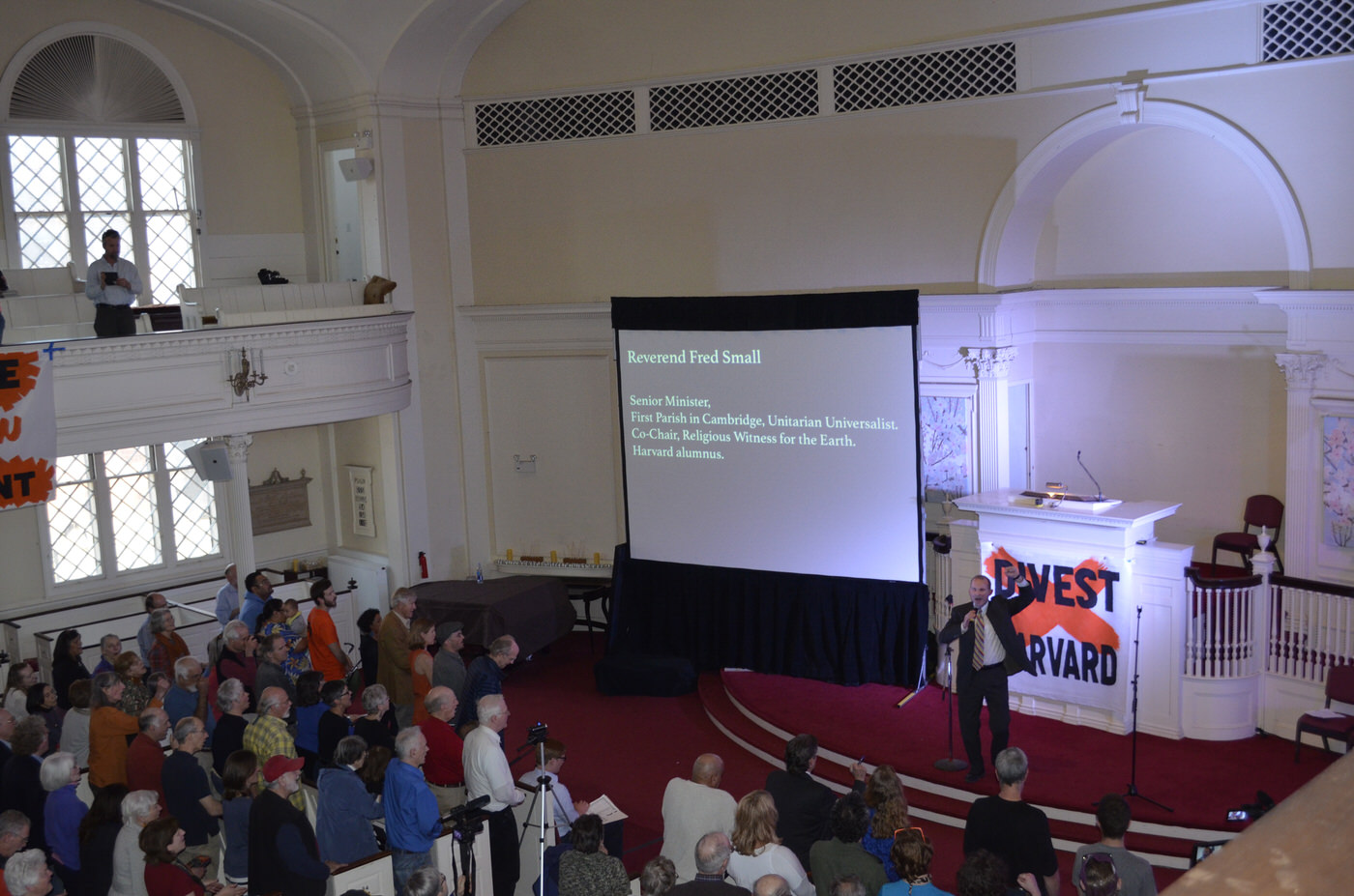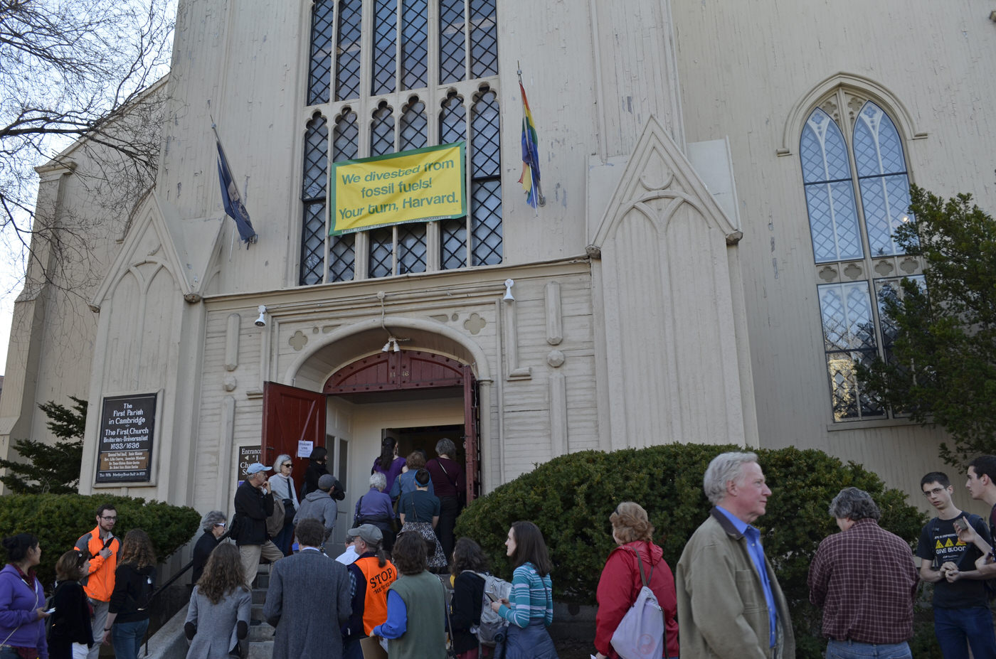 Earlier Sunday evening, more than 150 protesters had gathered across the street for Heat Week’s official launch event, held in the sanctuary of the First Parish in Cambridge. Heat Week, Divest Harvard co-director Talia Rothstein ’17 told the assembled crowd, is a moment of transition for the group, which began in the fall of 2012 with the mission of sparking public discussion among students and administrators about the possibility of divestment. The leaders of Harvard Faculty for Divestment have met privately with Faust and Harvard Corporation senior fellow William F. Lee, and student activists have led smaller-scale protests of Mass. Hall in the past. (A group of 14 occupied the hallways this February, and a student was arrested in connection with the protests last spring.) But, Rothstein explained, with no signs of change in administrators’ positions on divestment, activists felt that collective action on a much larger scale, with combined support of alumni, students, and faculty, was necessary to “shake Harvard University out of its centuries-old institutional slumber.” A recent analysis by the Swiss firm south pole group, conducted at the request of Divest Harvard and the international climate group 350.org, claims that greenhouse-gas emissions from the University’s fossil-fuel-connected holdings equal over “11 million tonnes” of carbon dioxide—roughly equal to all emissions from the state of Rhode Island.
