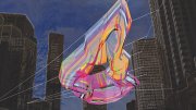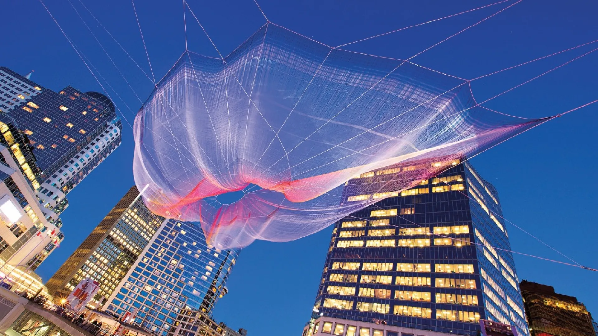The works of Janet Echelman ’87 tend to take on lives of their own. Installed in public spaces from Amsterdam to Sydney, her sculptures are essentially massive fishing nets that float high in the air, somewhere between taking off and coming in to land. Tucking and weaving into themselves, they reveal organic forms; projected colored light makes them appear internally luminescent. They have a biological essence, but seem more expansive than any organism. Gazing up through the bright, rippling screen of one of Echelman’s installations, viewers might imagine themselves at the center of a distant galaxy.