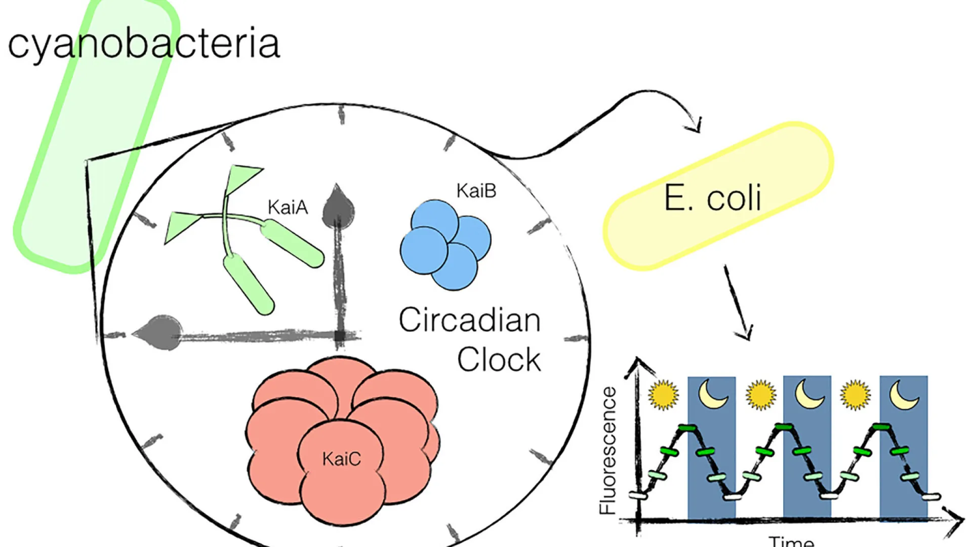 Anna H. Chen, a graduate of HMS’s systems biology department, led the new research while a doctoral student in the lab of Adams professor of biochemistry and systems biology Pamela Silver. The team, which published its work in the journal Science Advances on Friday, June 12, began by examining the mechanism behind the circadian rhythm in the cyanobacterium Synechococcus elongatus. These photosynthesizing bacteria use three key proteins to regulate their cycles of day and night. Past research had already established that, even when simply combined in a test tube, the three will bind and unbind in a regular, circadian rhythm. Chen used these proteins to build an “oscillator”—a biological function that turns off and on in a regular pattern—and transplanted it into the gut bacterium Escherichia coli.
