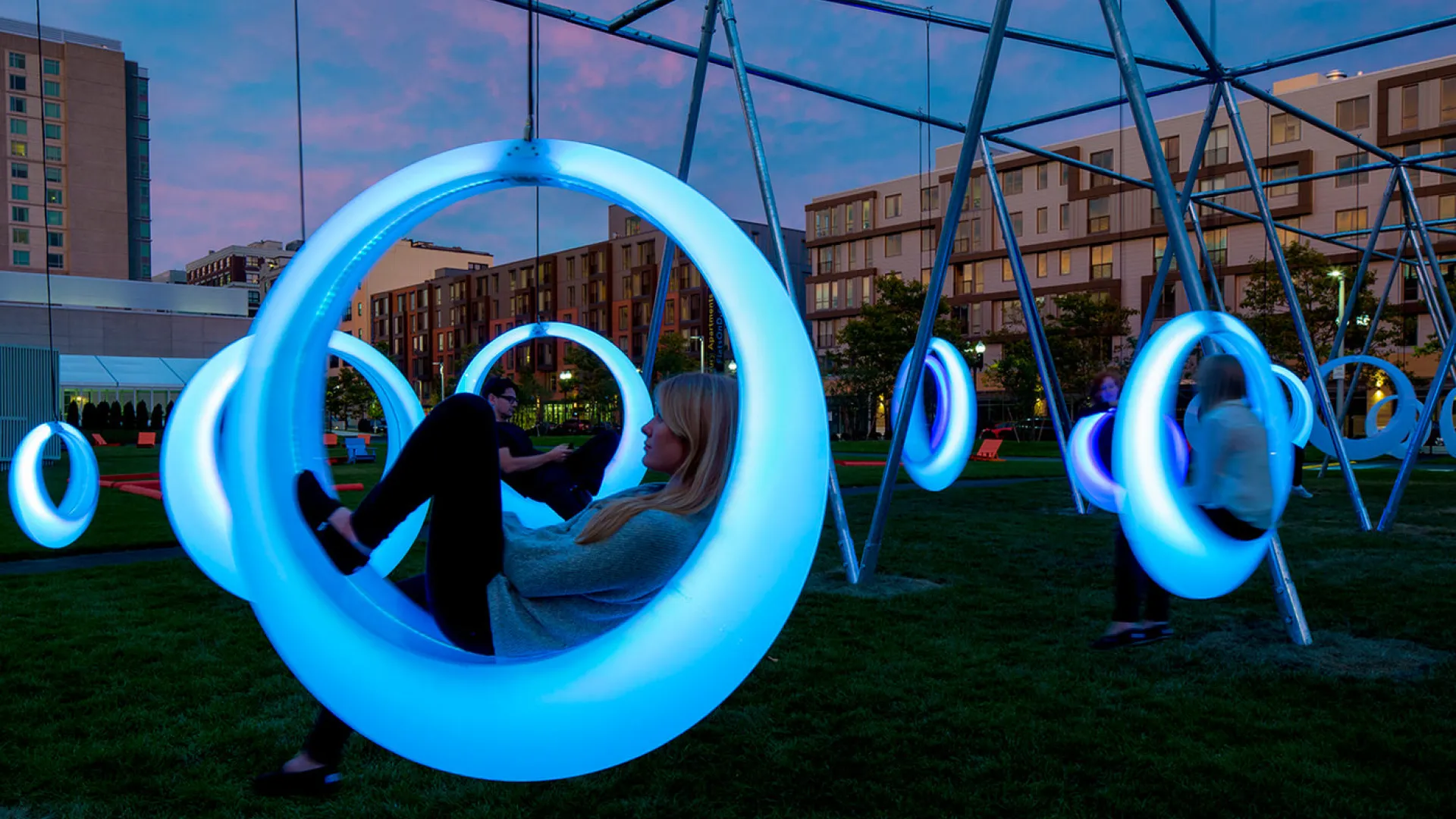 On weekend nights in summer, hundreds of Bostonians descend upon “Lawn on D,” a small park on South Boston’s D Street. They can be seen playing board games, enjoying a beer, attending a movie screening, or just relaxing with friends and family. But most of them are waiting for a turn to sit on one of the park’s 20 illuminated ring-shaped swings—the real reason they came here.