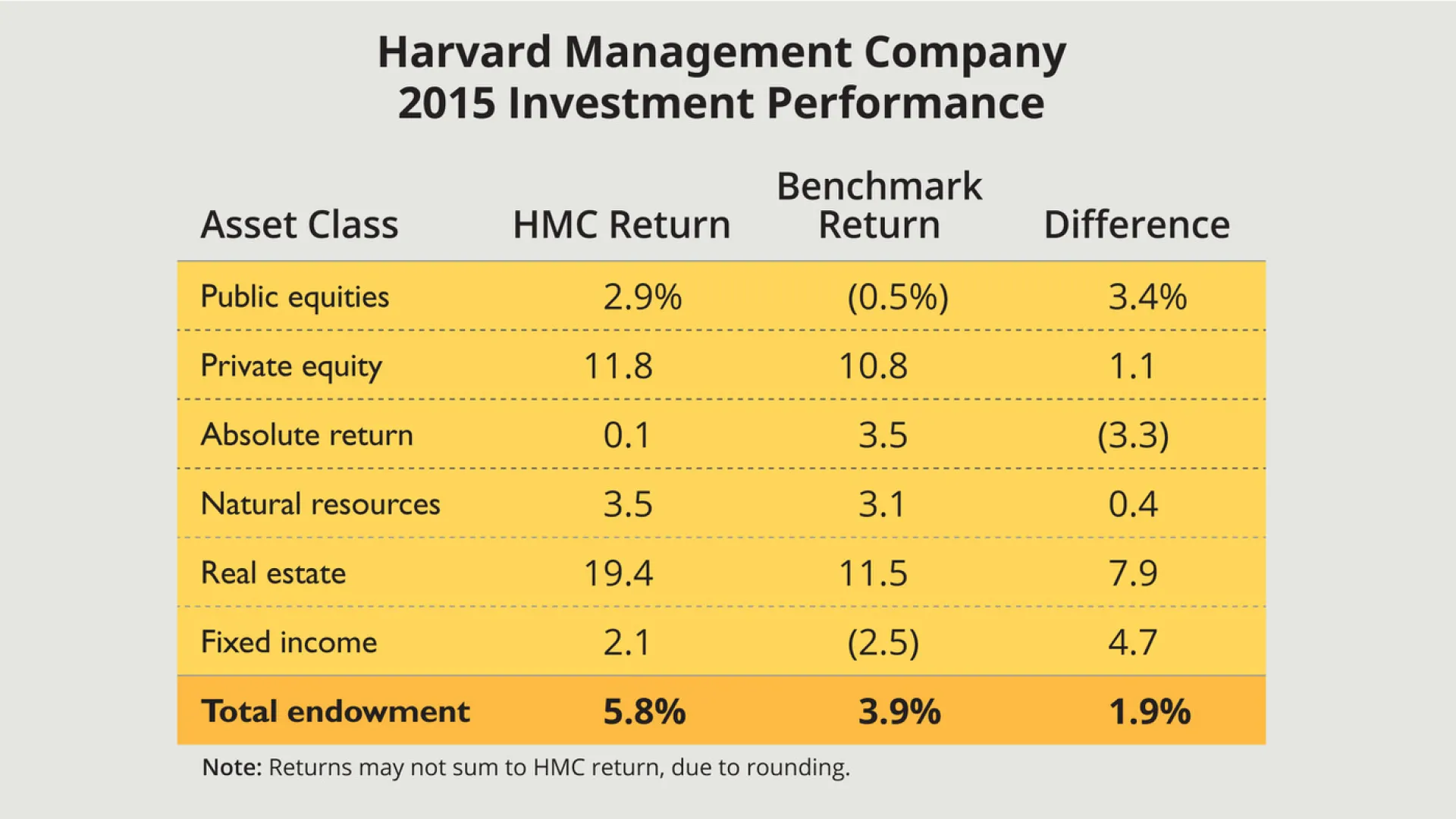 Public equities. Public stock investments—traditionally about one-third of HMC’s assets—produced aggregate returns of 2.9 percent, exceeding the negative market (benchmark) return of (0.5 percent). Blyth’s letter disaggregates the performance: