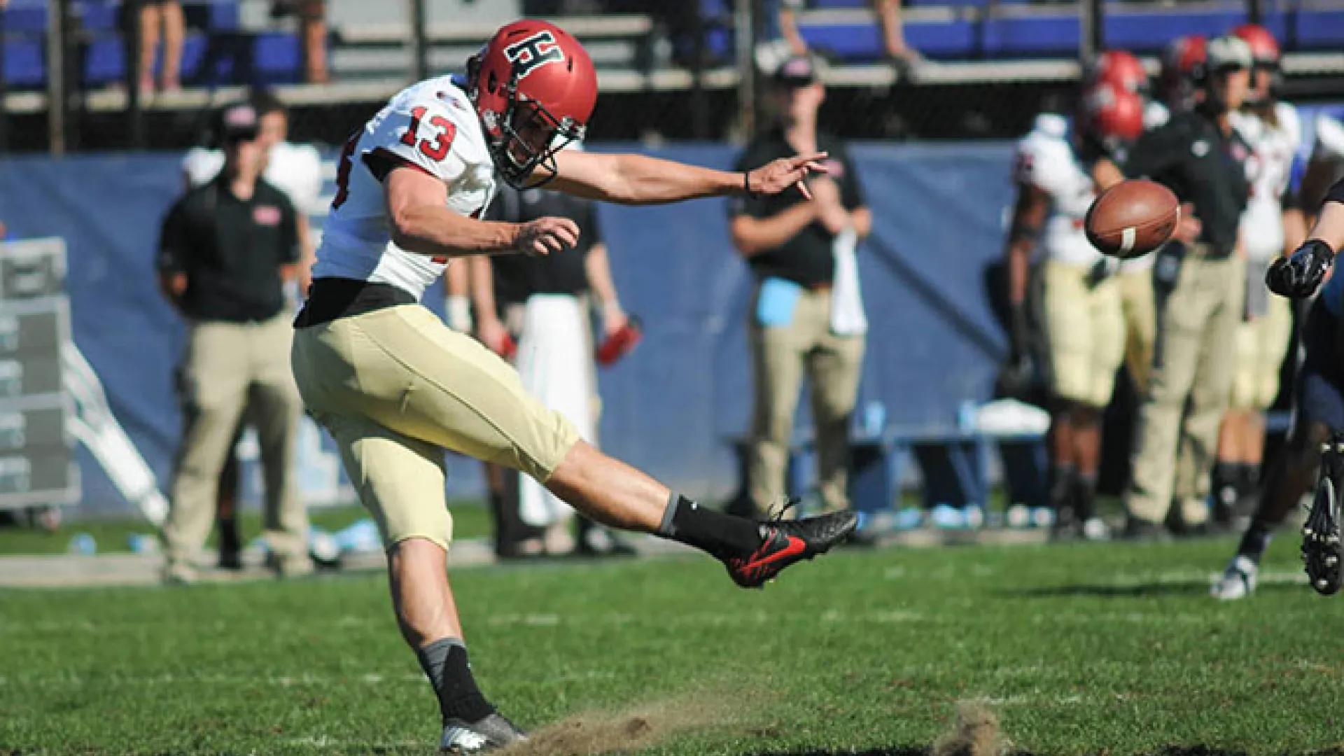 Hosch is gradually becoming the Bart Starr of Harvard football. As old-timers recall, the Green Bay Packers’ Hall of Famer was never flashy or a gunslinger; he just won. Togged out in new helmets (a decidedly lighter shade of crimson) emblazoned with “Ten Thousand Men of Harvard” in both English and Latin (to confuse opponents), the Crimson took the field at sunny and hot Meade Stadium, and Hosch set about showing his mettle. On the opening drive, which began at the Crimson 22, Hosch spread the ball on short passes to four receivers: in order, Seitu Smith ’16, Fischer, running back Paul Stanton Jr. ’16, and tight end Ryan Halvorson ’17. Then, from the Rams’ 45, he fired a bomb to Halvorson, who beat single coverage and scored the first touchdown of the season. Three minutes and 26 seconds had elapsed. Kenny Smart ’18 kicked the point after touchdown. Harvard 7, Rhode Island 0. Hmm…that didn’t take long.