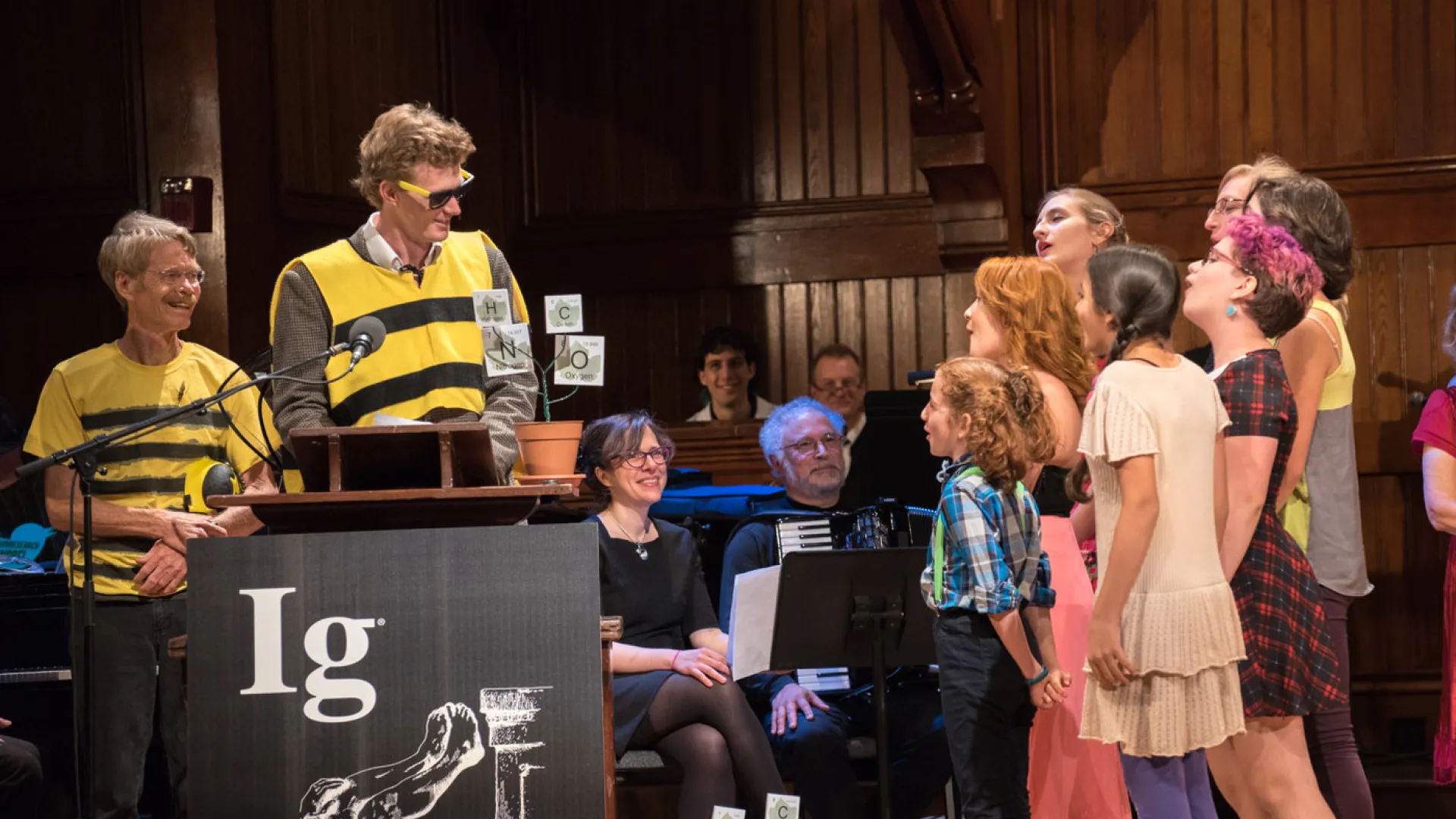A few hours before the actual ceremony, the Human Spotlight isn’t the only oddity in sight: two men in white lab coats are wandering about with accordions, pumping the bellows and pressing the keys, filling the resonant space with spindly arpeggios, while up on the theater’s balcony this year’s winners—“Ignitaries,” as their nametags have it—are gathered for a brief “press period” before the start of the official ceremony. The winners are spread around the balcony’s cushioned benches. Some are dressed in formal attire, while others wear props that correspond to their discoveries—a foam traffic cone on the head, for instance.