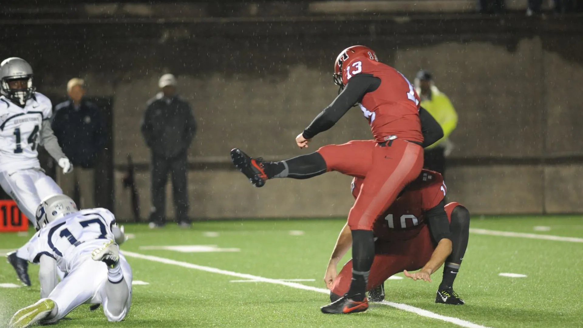 On the next possession Georgetown and its quarterback, Kyle Nolan, drove to the Harvard 16. The Crimson defense stiffened. Facing fourth-and-one, the Hoyas elected to try a field goal. “At that point we were just trying to get something on the board,” said Sgarlata afterward. But Henry Darmstadter missed—wide left. (Just our hunch: Inveterate gambler Murphy would have attempted to get the first down.)
