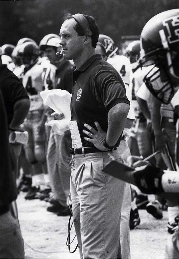 “Tuesday, Wednesday, and Thursday are the same: a three o’clock meeting, four o’clock practice, off the field at six. In season we don’t do any scrimmaging. We call it high and hard tempo: nobody leaves his feet, kind of an NFL mentality. Thursday—and I’ve been doing this for 30 years—we take the pads off.” No protective gear means no blocking or tackling. “On Friday we have what we call a ‘mental practice.’ We go through every possible scenario of the coming game. Every position on our team has a test. To some extent, we tell our players that this is a take-home exam.”