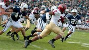 Once play begins, coaches and players are on a treadmill. “Sunday is a long day,” says Murphy. “At one o’clock p.m., the kids report to sports medicine. At two, there’s strength and conditioning. From three to five you go over the video from the previous game. At five o’clock you have a meeting on the field to showcase your next opponent. Monday is a day off mandated by the NCAA.” But not for the staff. “We get the video Monday morning [of the next opponent]. We also get statistical computerized analyses of all tendencies—field position, down and distance, personnel….We’ll watch all the situations and formulate a game plan, bit by bit.