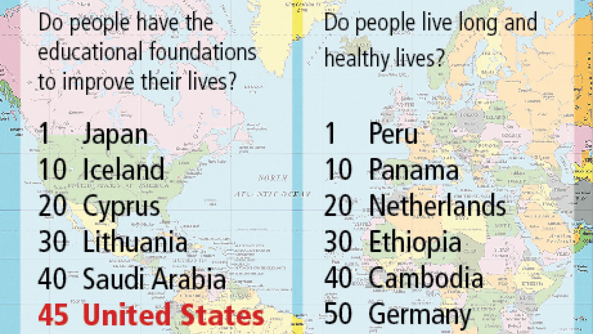 The United States may rank sixth among countries in terms of GDP per capita, but its results on the Social Progress Index are lackluster. It is sixteenth overall in social progress: well below Canada, the United Kingdom, Germany, and Japan in several key areas, including citizens’ quality of life and provision of basic human needs. The nation ranks thirtieth in personal safety, forty-fifth in access to basic knowledge, sixty-eighth on health and wellness, and seventy-fourth in ecosystem sustainability. “We had a lot of firsts in social progress over the years in America,” Porter points out, “but we kind of lost our rhythm and our momentum.”