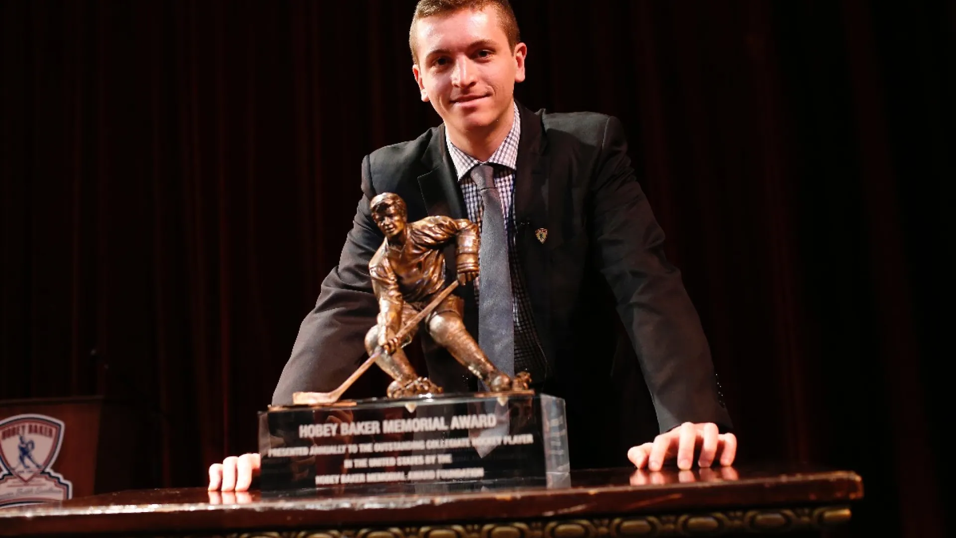 Vesey is a two-time conference player of the year and a two-time first-team All-American, and his Hobey Baker Award is the first brought home by a Harvard player since 1989, when Olympian Lane MacDonald ’88 won. That same year, MacDonald led Harvard to a NCAA championship—it still stands as the Crimson’s most recent national title. Before that, the Fusco brothers, Mark ’83, M.B.A. ’90, and Scott ’85, won Hobeys for Harvard in 1983 and 1986 respectively. This month, when Vesey stood up at the podium to accept the trophy at the NCAA Frozen Four in Tampa, he called himself humbled. “A great honor,” he said. Voted on by all 60 Division 1 head coaches, fans, and a selection committee, the award recognizes outstanding skills in all phases of the game, strength of character on and off the ice, sportsmanship, and scholastic achievements.