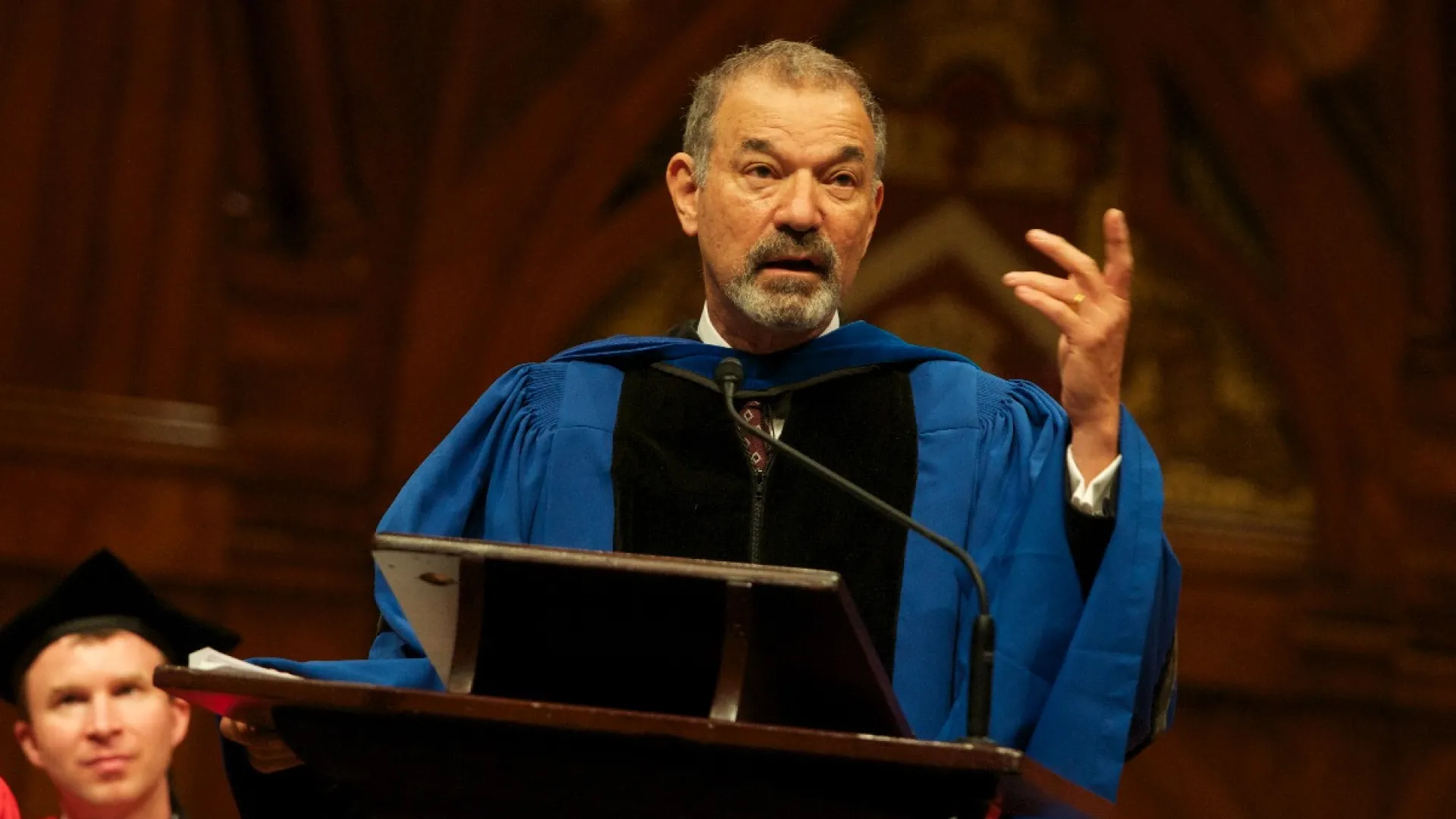 Resplendent in his robes—conspicuously blue—Greenblatt spoke about the value of the liberal arts, foregrounding his remarks with his own undergraduate experience some 50 years ago. Descended from Lithuanian immigrants, and raised by parents who hadn’t attended college, the young Greenblatt encountered Yale as “an unfamiliar country whose customs I knew I could never master.” (The title of his speech, he explained, was a play on a 1904 quote from Henry James, in which he—with distaste, not admiration—described the “waiting spring of intelligence” within the immigrants he observed in New York; Greenblatt, in 1960, embraced this quality in himself.) The professor then recounted two formative freshman-year experiences: a dispiriting exchange with an anti-Semitic financial-aid officer (“Even decades later I recall it with a blend of outrage and wonder”), and encountering the “rapacious Jewish usurer, Shylock,” in Shakespeare’s The Merchant of Venice. Despite the prevailing xenophobia of his time, the playwright, Greenblatt said, had created a villain who nevertheless has “more theatrical vitality, quite simply more life—intense, urgent, and compelling—than anyone in his world.”