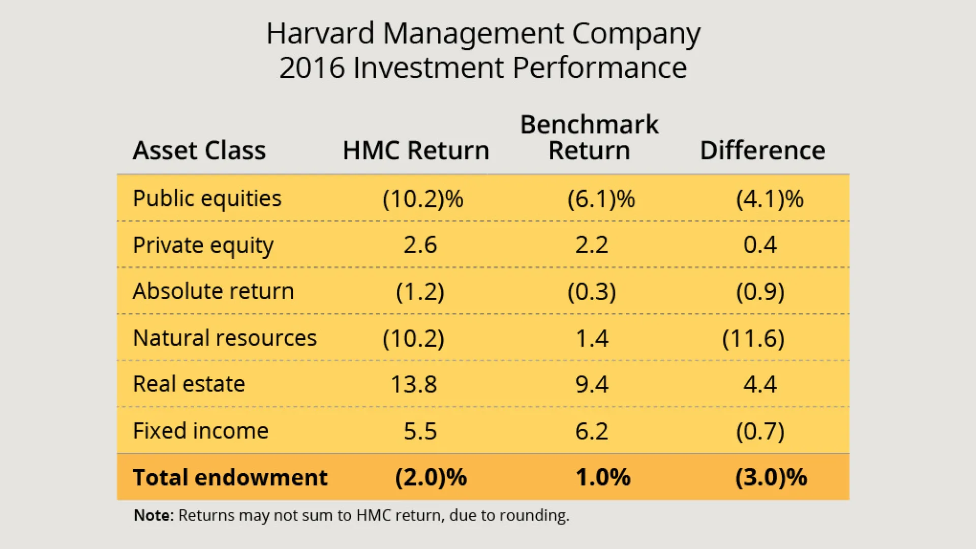 •Harvard Management Company (HMC) recorded a negative 2.0 percent investment return on endowment assets during fiscal 2016, following positive returns of 5.8 percent in the prior year and 15.4 percent in fiscal 2014. (The return figures take investment fees and expenses into account.) Weak results, in a challenging investment environment for most endowments, were foreshadowed during the summer, as previously reported. The results modeled there assumed a modestly positive return on Harvard’s endowment investments; the results reported today—the (2.0) percent return—trail that estimate. Updated September 23, 2016, 11:40 a.m.: Yale reported a positive 3.4 percent investment return for fiscal 2016, enabling it to report an 8.1 percent cumulative annualized rate of return during the past decade. Given the positive investment return, the value of the Yale endowment decreased minimally, from $25.6 billion to $25.4 billion, after accounting for distributions, which appear to have exceeded $1 billion. Updated September 28, 2016, 11:00 A.M.: Stanford reported an investment return of negative 0.4 percent; after accounting for endowment distibutions ($1.13 billion) and gifts received, the endowment rose 0.8 percent in value, to $22.4 billion. Updated October 11, 9:05 a.m.: Princeton reported a positive investment return of 0.8 percent for the fiscal year, joining Yale as the only Ivy institutions to have positive returns for the period. Columbia reported a negative 0.9 percent investment return for the period—the last under the management of N.P. Narvekar, HMC's new leader.