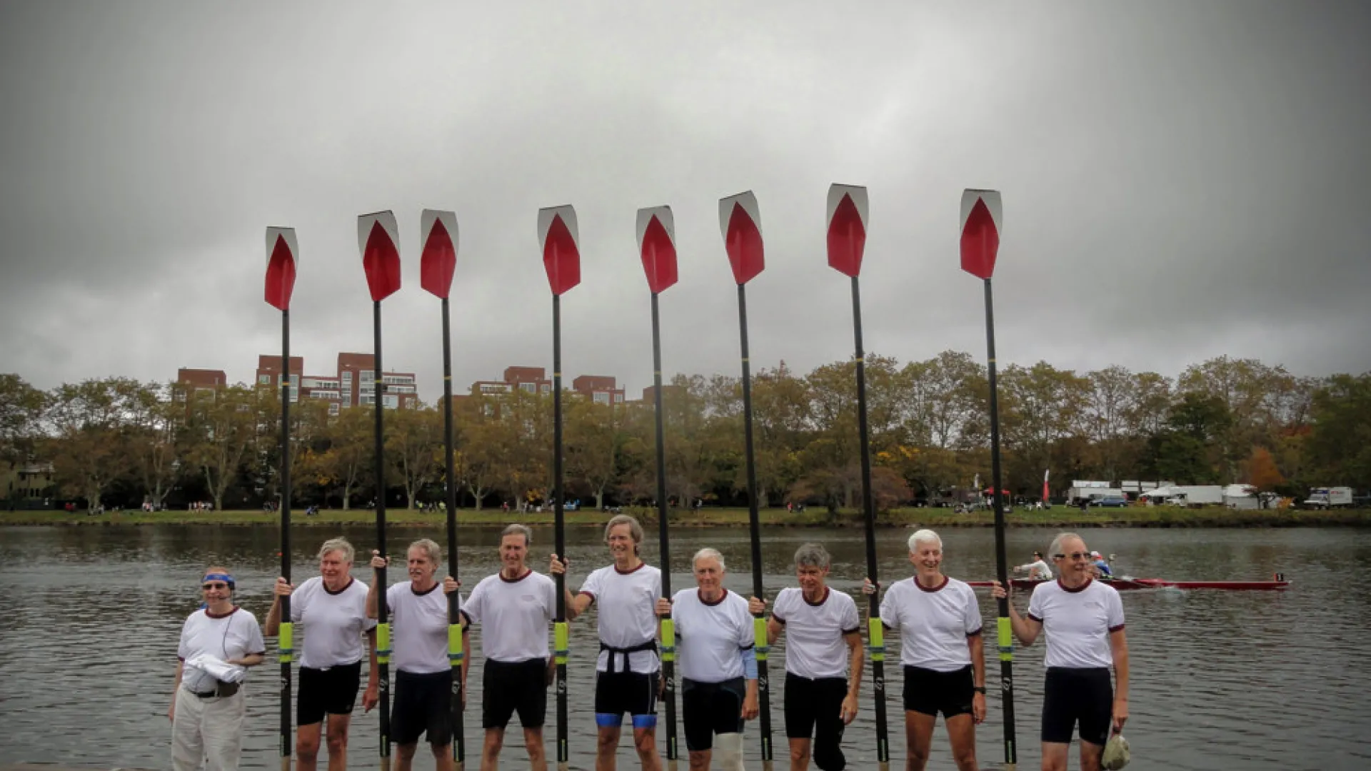 The forecast for the Head of the Charles was bad weather, but early on Saturday a light drizzle flattened the water and the wind was calm. “Not too cold, not too warm—perfect,” Tonks said, looking out from the Newell Boathouse dock. A few minutes later, they lined up their oars and took down the long black racing shell they’d borrowed from Charley Butt, Bolles-Parker head coach of the men’s heavyweight crew. They carried the boat to the water, lowered it in, and climbed aboard in stockinged feet. Then, waving goodbye to wives, children, grandchildren, friends, and one fiancée, they rowed off toward the starting line. They didn’t look nervous. Their oars were turning in unison.