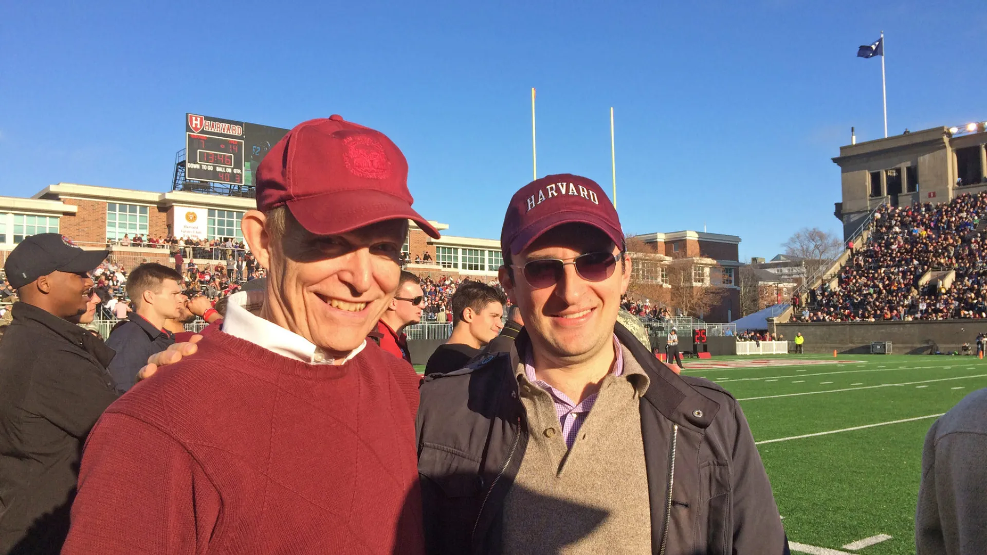 At the start of the second quarter, with the score tied at zero, the two jovially explain the duties of being a faculty fellow to the Harvard football team.
