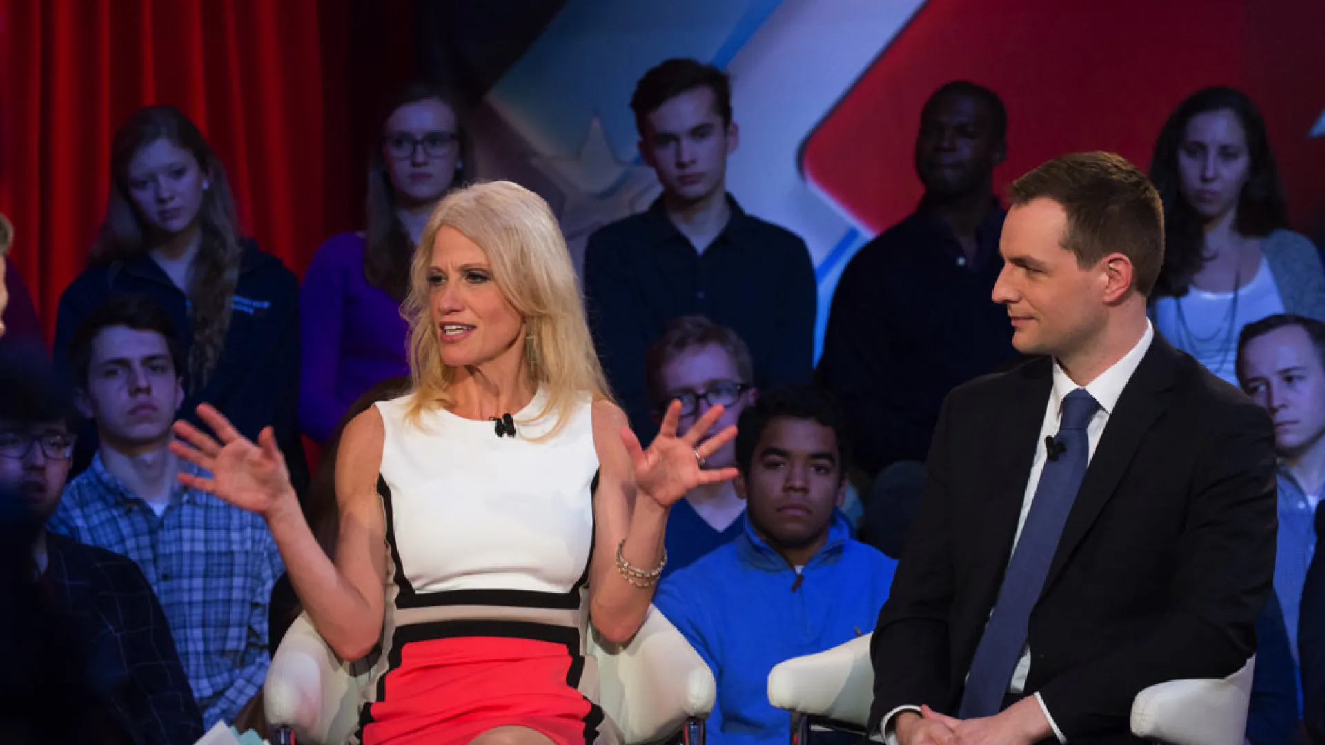 The Kennedy School’s Institute of Politics teemed with bodies far in advance of last night’s much-anticipated post-election panel featuring president-elect Donald Trump’s campaign manager, Kellyanne Conway, and Hillary Clinton’s campaign manager, Robby Mook—the first time the two have appeared together publicly since the election. Harvard has held similar post-election events for decades, but this year was unlike other election years. Thousands of people indicated on Facebook that they would protest this year’s lineup—which originally included Trump campaign CEO Steve Bannon, M.B.A. ’85—and call on Harvard not to legitimize the president-elect’s platform. Bannon abruptly canceled his appearance on Tuesday, reportedly due to a scheduling change (he accompanied the president-elect on a campaign-like trip to Indiana and Ohio on Thursday). As reported, a few hundred protesters gathered Wednesday evening, while strategists from both campaigns met at the Harvard Kennedy School. But there were no protesters to be seen at yesterday’s panel, “War Stories: Inside Campaign 2016,” which began on a strikingly cordial note.