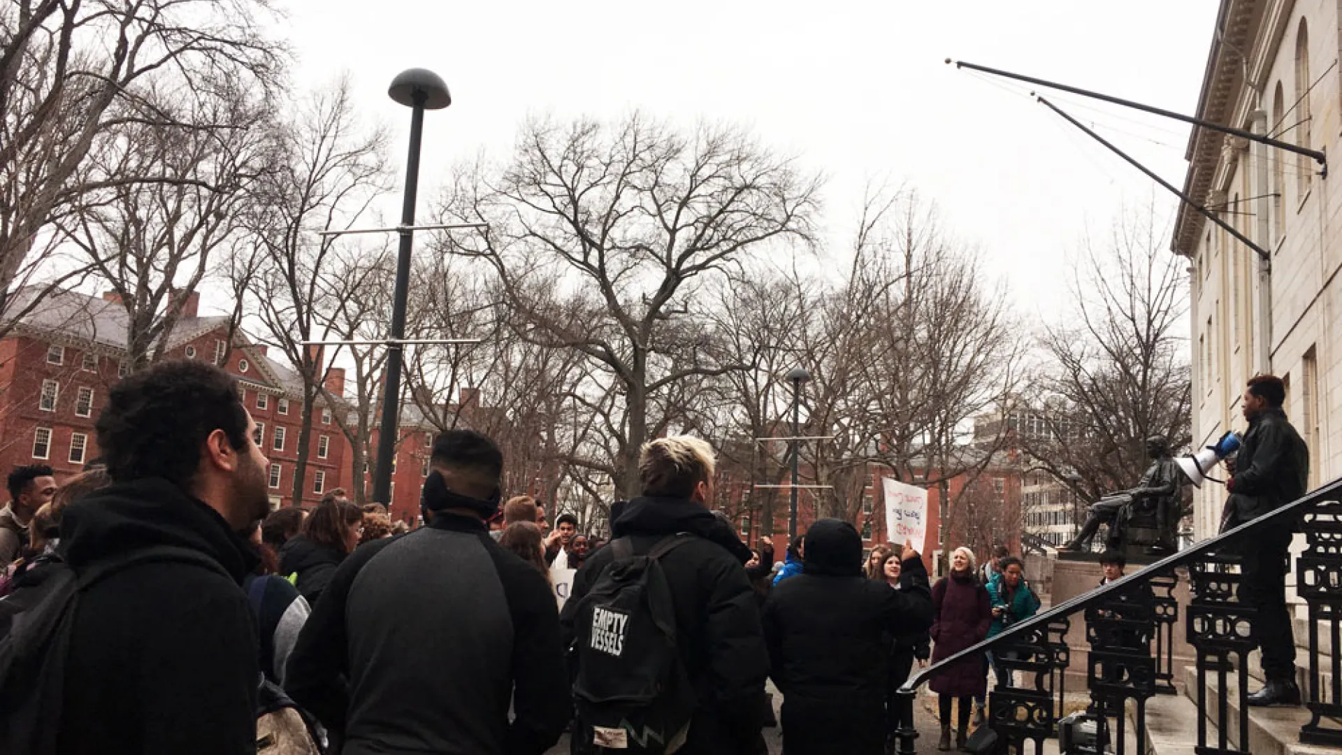 Representatives from eight student organizations—including Divest Harvard, the group advocating University divestment from endowment investments in fossil-fuel producers; the Harvard Islamic Society; and Act on a Dream, an advocacy group for undocumented students—took turns reading their demands to a steadily growing crowd of student protestors. Many organizers cited their own experiences as members of marginalized communities, and praised peer academic institutions that have declared themselves “sanctuary campuses” in response to Trump’s anti-immigrant rhetoric. Each speaker came back to the same message: that the post-election political climate is a critical opportunity for Harvard to act as a leader on inclusivity and equality.