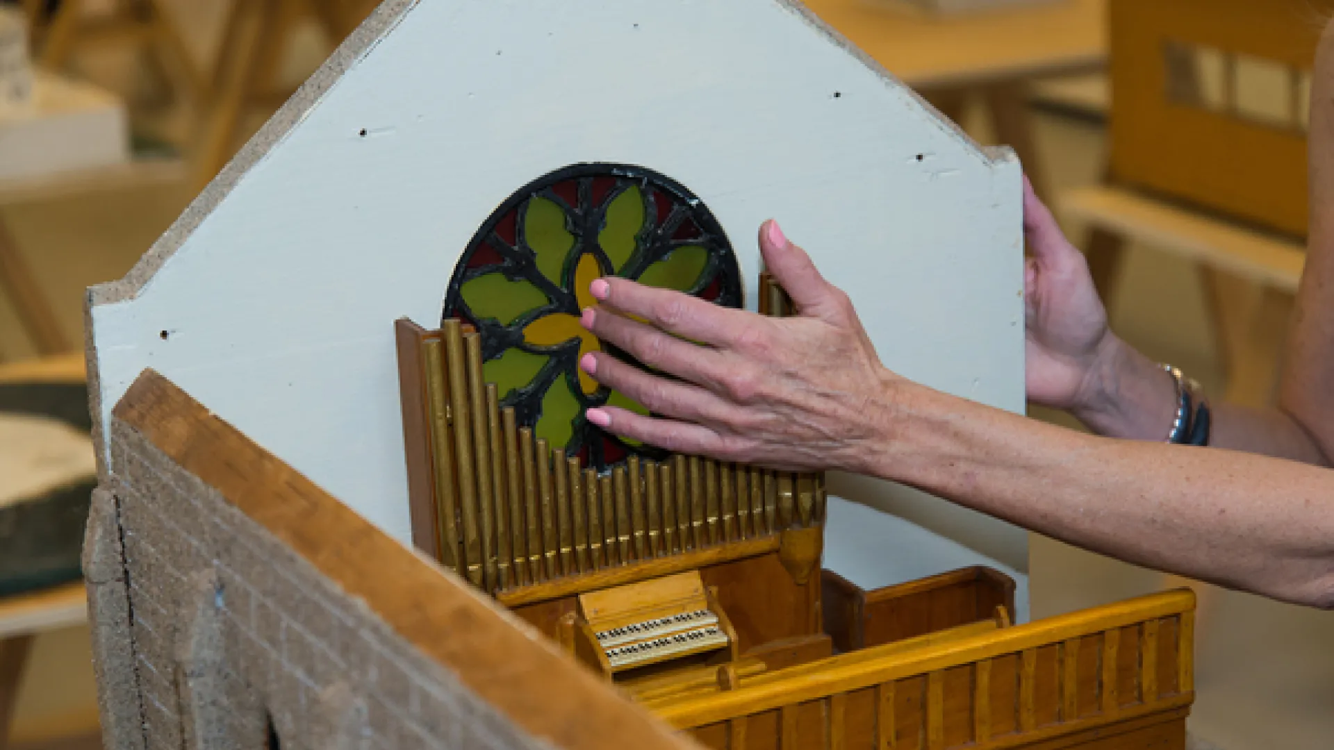 If you're like me, you tend to enter a room with your eyes before your ears or nose or fingertips make it inside. The first thing you notice in “Calm. Smoke rises vertically.”—Wendy Jacob’s exhibition at the Radcliffe Institute’s Johnson-Kulukundis Family Gallery—are the miniature buildings perched on simple saw-horses arranged in a grid pattern around the gallery. They’re mostly places you’d recognize—the Parthenon, the U.S. Capitol. Some are more generic: there’s an airport hangar with a plane, and a skyscraper and a Catholic church. There’s a pyramidal building which turns out to be the Tower of Babel.