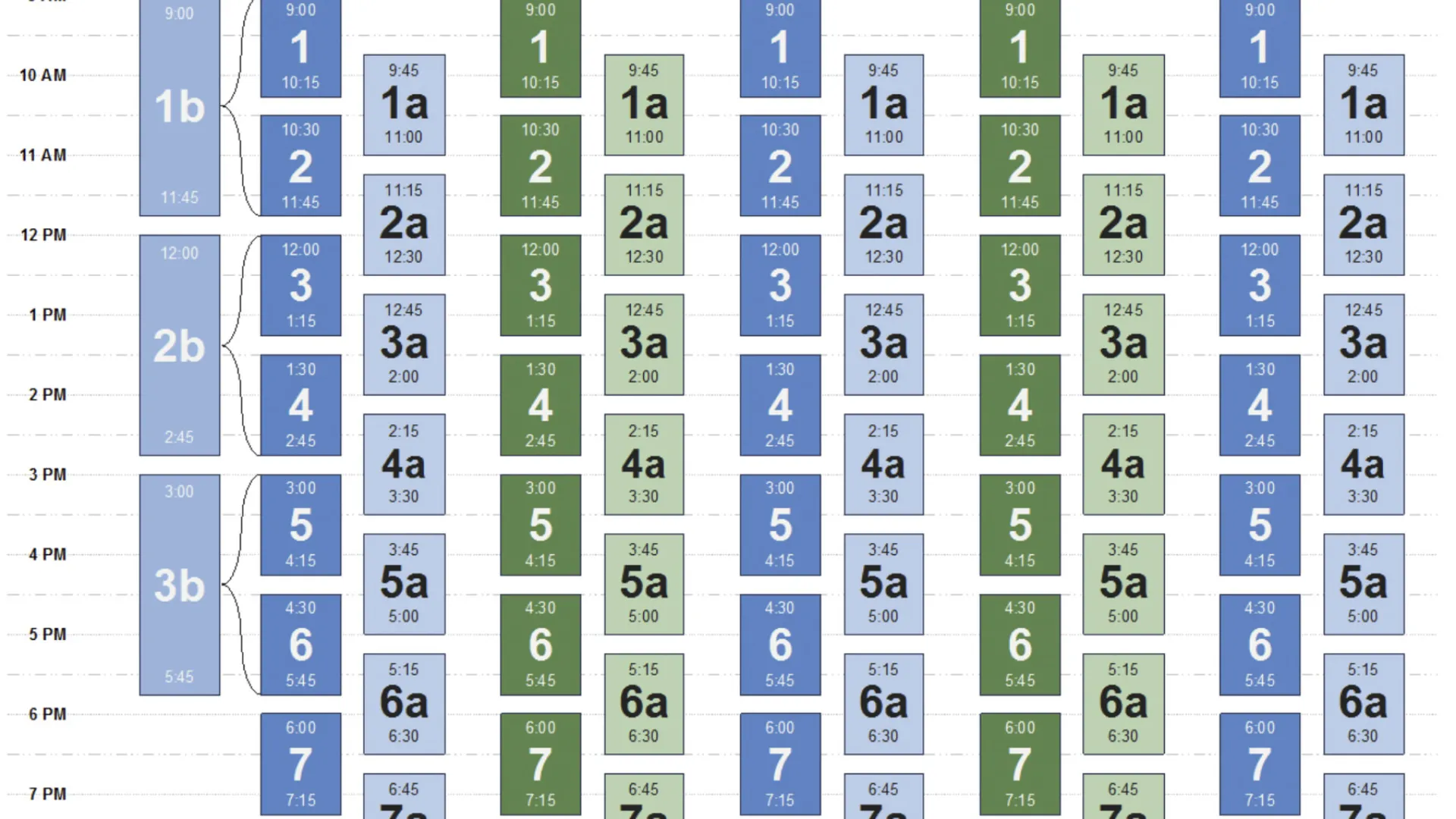 - That, on each of the Cambridge and Allston sides of our campus, class start times are separated by 90 minutes. [That is, classes in Cambridge would begin at 9:00, 10:30, and so on; and those in Allston at 9:45, 11:15, and so on.]