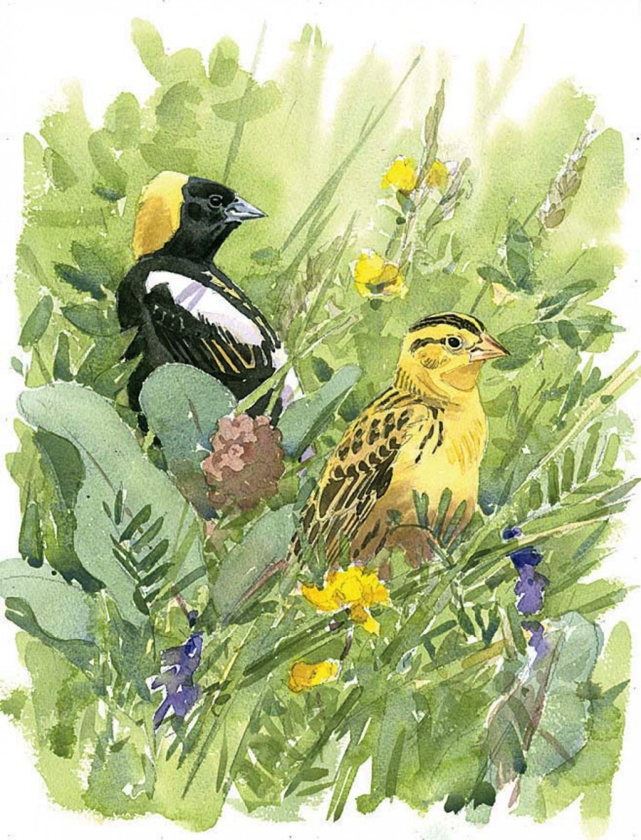 At the Daniel Webster Sanctuary in Marshfield, Van Dusen set up his stool, art supplies, and binoculars beside a swath of wetlands, and was lucky enough to watch a Virginia rail and her chick. The secretive, long-toed birds dwell deep in the cattails, but here “wandered around together in the open and picked at a pollywog,” he reports, enabling him to produce a watercolor of the pair. It’s on display, along with about 50 more of his sanctuary works, at the Museum of American Bird Art at Mass Audubon, in Canton, Massachusetts, from May 21 through September 17.