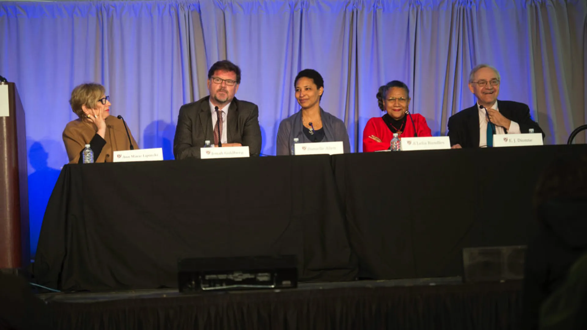 The crowd at Radcliffe was receptive, frequently bursting into applause, laughing ruefully at jokes about the state of American politics, and murmuring in agreement at points of reflection about the caliber of Ifill’s reporting. “A vocation is what you are summoned to do in life. A career is a choice. Judy and Gwen have demonstrated commitment to their vocation,” said New York Times columnist David Brooks in his brief remarks opening the day’s program. Following Brooks’s commentary, Ann Marie Lipinski, curator of the Nieman Foundation for Journalism, took the stage to moderate a panel discussion on “(Un)Truths and Their Consequences,” featuring Conant University Professor Danielle Allen; A’Lelia Bundles ’74, author and former television executive and producer at NBC News and ABC News; E.J. Dionne ’73, columnist for The Washington Post; and Jonah Goldberg, senior editor at the National Review.