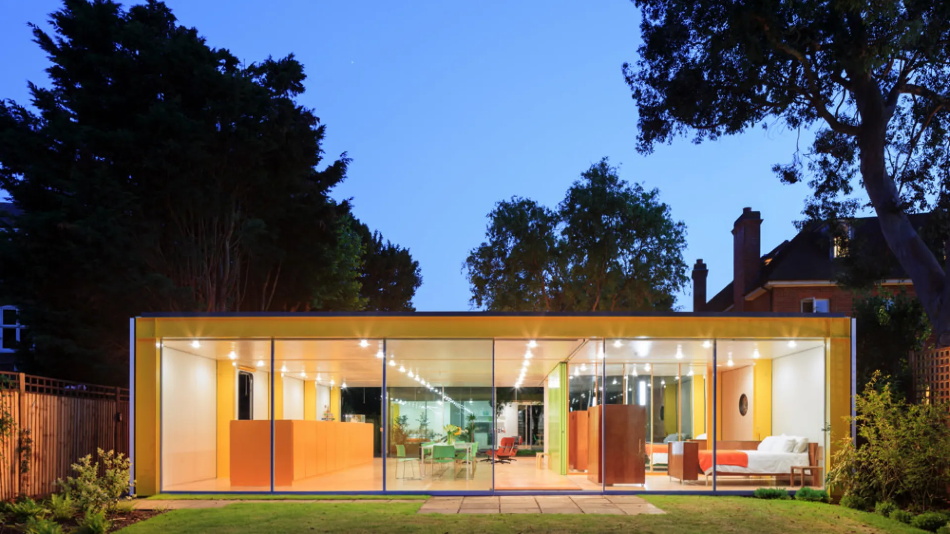 Much like the fellowship, Wimbledon House, built between 1969 and 1970, is one of a kind. Rogers described the design as a “transparent tube with solid boundary walls.” The property consists of two structures, separated by a courtyard. A wall of trees separates the first structure from the street, and a deep garden is tucked behind the second. The “transparent tube” becomes clear when all of the pea green and macaroni orange walls are slid to the side, and one can see straight through from the back garden to the trees lining the road. Windows with rounded corners and blinds complete the feeling of a deconstructed camper from the 1960s.