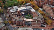 CAMPUS RECONFIGURED: Harvard Kennedy School unveiled its renovated, reconfigured quarters to the public on December 1. In effect, a new ring of buildings has been inserted within the existing one, and below the prior courtyard. A view from the latter (first gallery image, above) shows the bridge structure created to partially enclose the pedestrian and vehicular entrance from Eliot Street. The aerial (second image) reveals the layout, the bridge, and the link building that closed the gap facing the Charles Hotel complex to the upper right (west). Also shown are a detail from within the courtyard, and a new social space connecting dining areas with the JFK Jr. Forum. Read more at harvardmag.com/hks-redo-17.