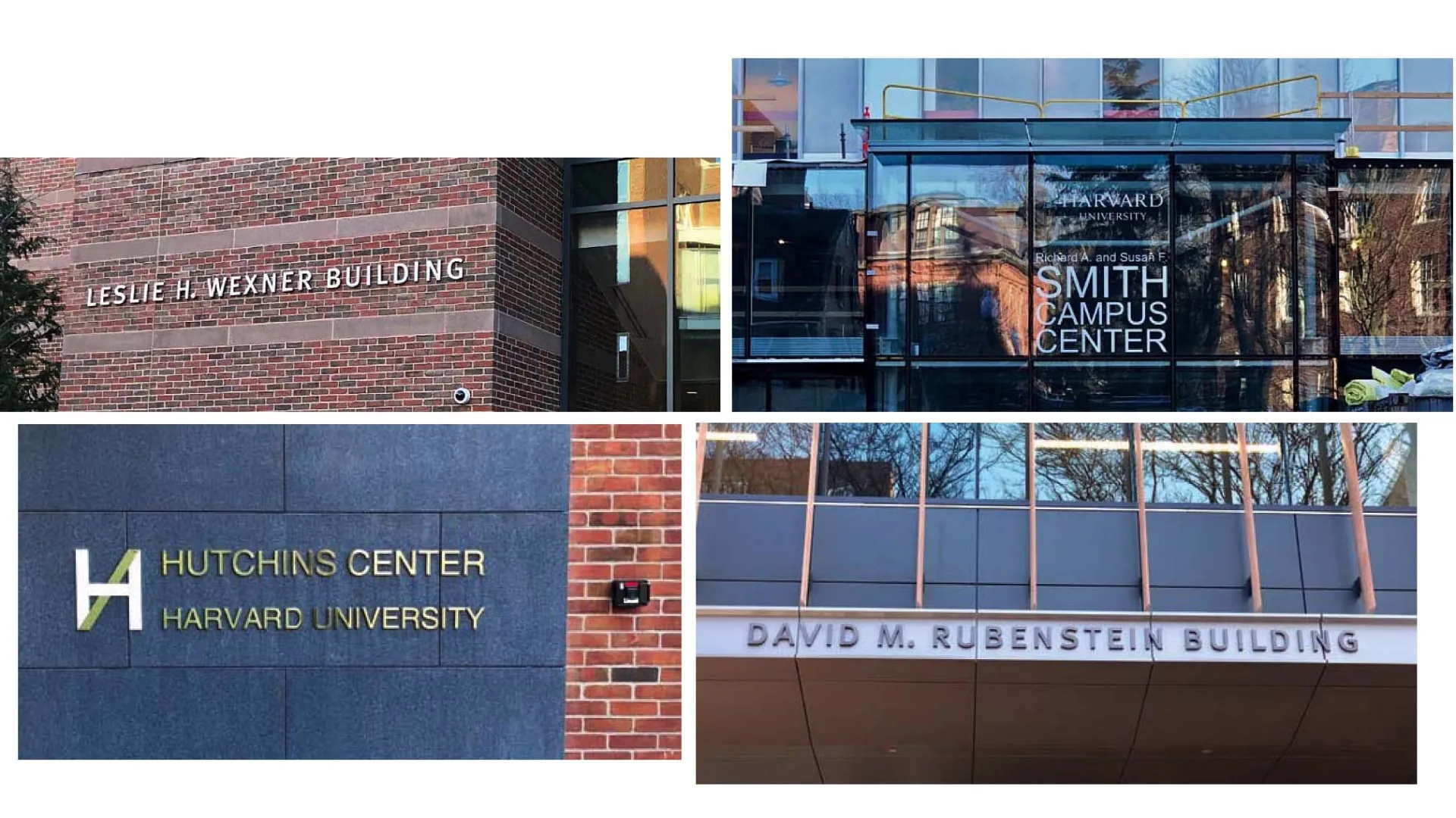 A capital campaign often changes the look of a campus—especially Harvard’s current one, with its pronounced emphasis on bricks and mortar (and glass and steel and…), from undergraduate House renewal to the Business School’s Klarman Hall “convening center” (see “Klarman Construction”) and the (as-yet-unnamed) science and engineering complex across Western Avenue. New or renovated structures apart, the appearance of the place also changes as donors avail themselves of what development officers call “naming opportunities.” Shown above, a few refulgent reminders of this especially fruitful fundraising drive, writ large and meant to carry the memory of contemporary Harvard forward unto the many campaigns undoubtedly to come, “in the Age that is waiting before.”