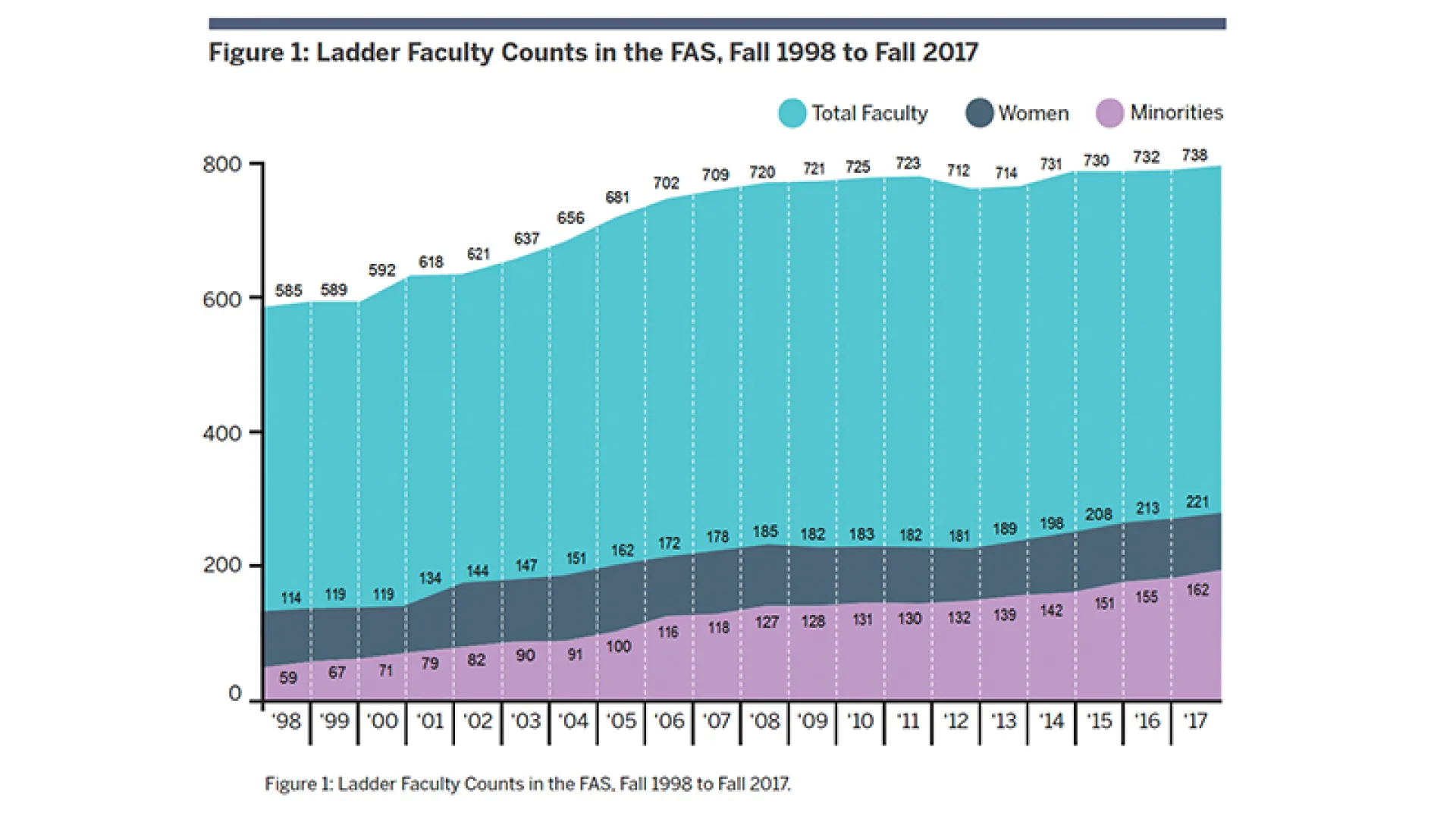 Also noteworthy is the University’s persistent lack of black and Latino faculty—just 9 percent of both tenured and tenure-track faculty in FAS are underrepresented minorities, pointing to a worrying pipeline problem. The report stresses the need to develop minority scholars early: “[W]e need to focus earlier in the pipeline by encouraging undergraduates to participate in research programs and by building postdoctoral programs that support and develop exceptional and traditionally underrepresented scholars.”