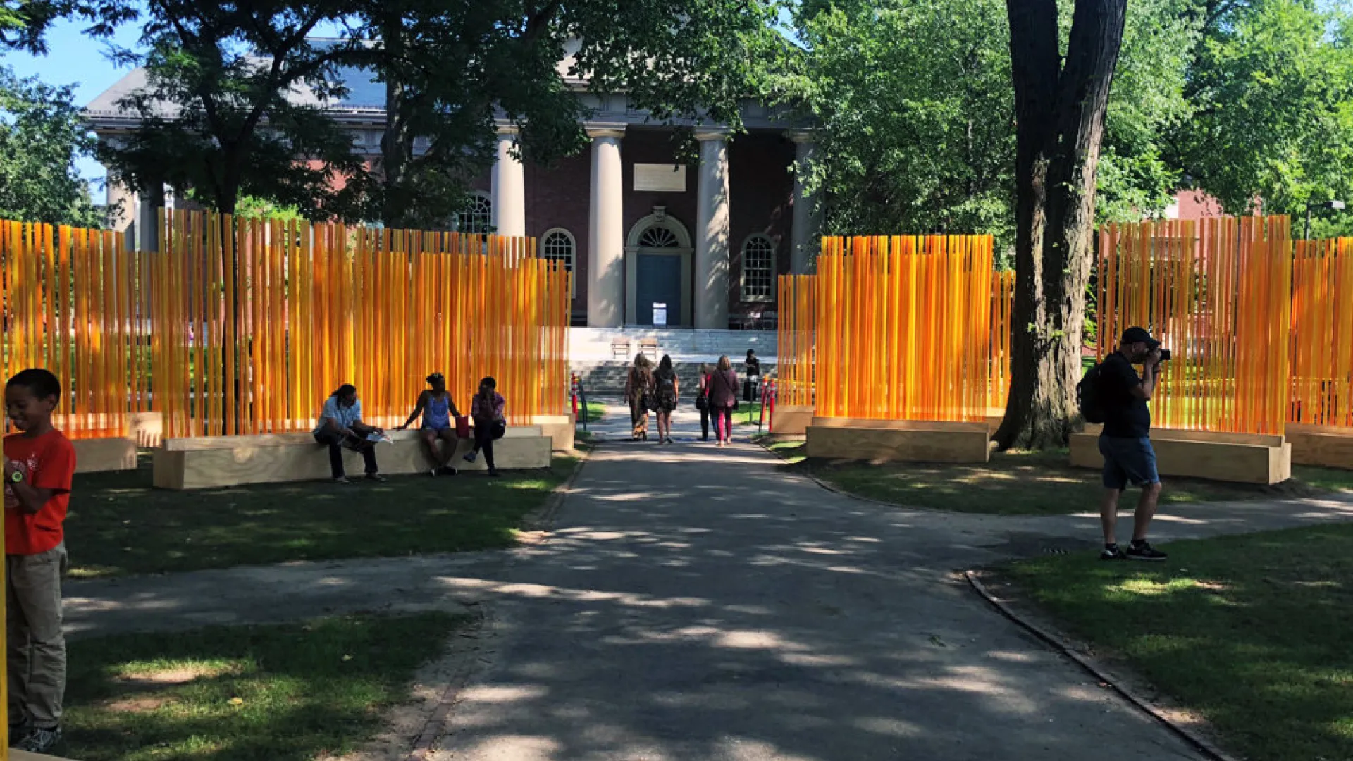 To the passing observer, Autumn (...Nothing Personal) is merely a cluster of tall plastic yellow and orange tubes mounted on simple wooden benches in the middle of Harvard’s Tercentenary Theatre. Artist Teresita Fernández, a first-generation Cuban American and the first Latina appointed to serve on the U.S. Commission of Fine Arts, says her installation is intended to fundamentally reframe a popular common space and encourage members of the Harvard community to see an historic, cherished landscape in a completely different way. “This word ‘landscape’ is often thrown around. It’s one of those words, like ‘community’ that doesn’t really mean anything, but it gets used a lot as a placeholder for generic ideas,” she said during a talk at the Harvard Art Museums on September 20. “I played with that. If you take the idea of a landscape and you start to think of it not as something passive but as a vehicle to have a larger conversation about place, you engage in this constant exercise of recalibrating where you are and, by extension, who you are in relation to one another.”