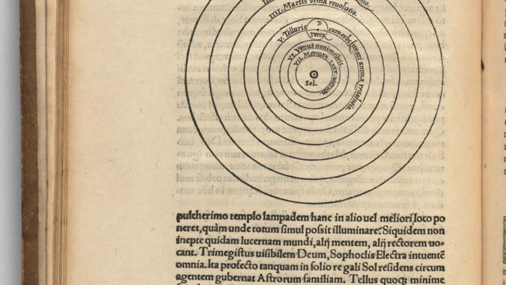 The materials are displayed roughly chronologically, starting with a first edition of Copernicus’s De Revolutionibus Orbium Coelestium, his foundational work on the heliocentric theory published just before his death. (Read “The Copernicus Quest,” on a Harvard scholar’s search for Copernicus manuscripts.) The idea that the Earth was not at the center of the universe was so controversial that Copernicus’s editor, Andreas Osiander, inserted an unauthorized preface suggesting the work was meant purely as a hypothetical exercise.