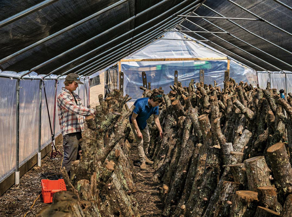 Logs that are ready for fruiting are soaked by groups in a dumpster-size vat of water and transferred to the greenhouse, says French, who runs the farm’s complex logistical operations alongside the company’s only other employees, Pforzheimer’s younger brothers Jack and Ross. The immersion helps induce fruiting, which takes five or six weeks. “On average, each log produces eight to 12 mushrooms per fruiting time at five times a year, for three years,” French says. The farm processes more than 10,000 logs a year from its 45,000-log inventory, with a late-winter break.