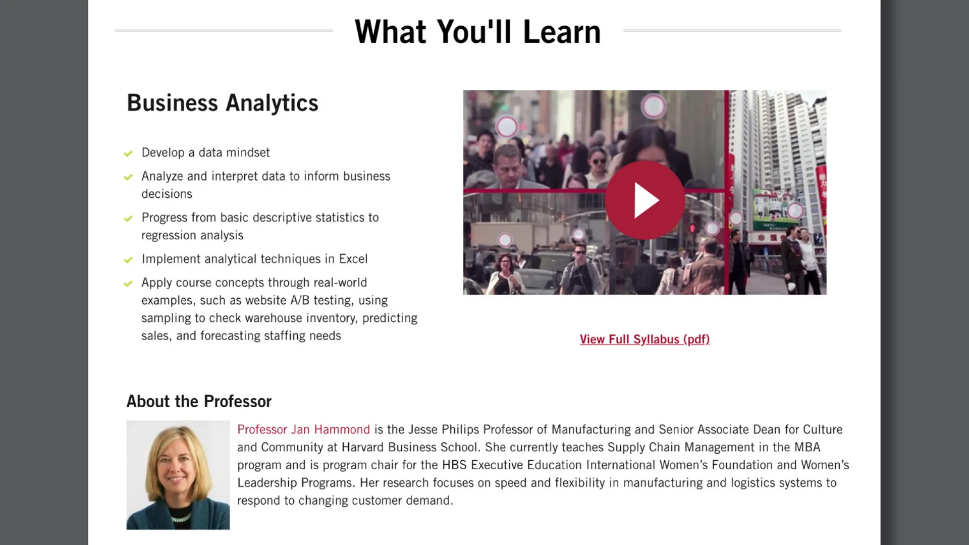 - company case studies (for example, the first economics module includes conversations with the head of Boston’s Ace Ticket, a reseller, talking about customers’ willingness to pay for seats for the deciding 2019 championship playoff game featuring the hometown Bruins)—a vivid representation of HBS’s famous teaching cases, a method with which many college graduates are not acquainted;