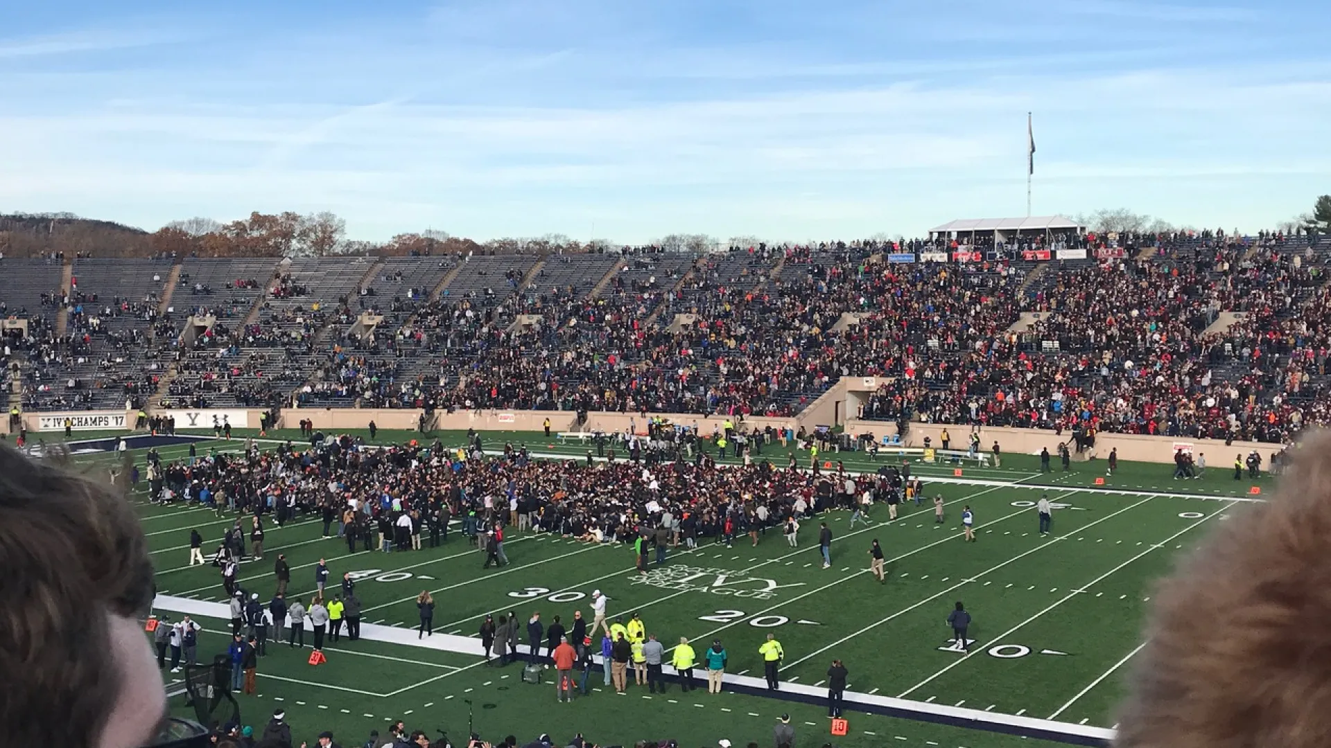 As the mass of students grew larger, it became increasingly unclear whether the game would continue. “Ladies and gentlemen,” pled Yale’s announcer, “as a courtesy to the players, you’re asked to clear the field.” He made this announcement again, and again, and again: “The players must come back on the field.” Some booed, some cheered. His pleas had little effect.