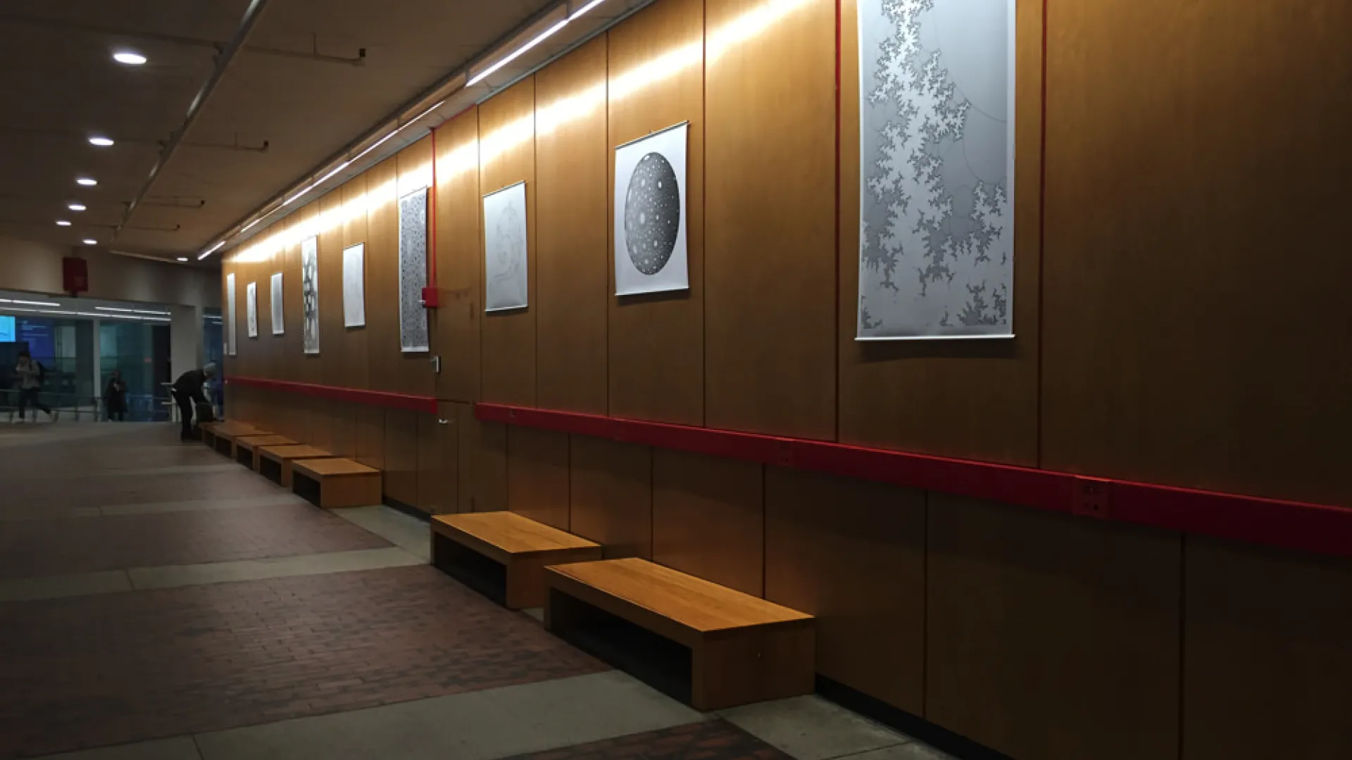 Each of the other prints follows its own internal set of rules. Many are generated by a simple pattern of lines reflected many times, the way two mirrors across from one another create the appearance of a tunnel extending infinitely far into the distance. All share a complex relationship to what mathematicians call “negatively curved space”—an exotic place where normal geometric rules like the Pythagorean theorem no longer apply. But despite all the mathematical rigor behind his prints, McMullen has decided against explaining how he created the images in his exhibition. “People often have a negative reaction to the word ‘mathematics,’ right? I didn't want to push that it was mathematics. I didn't want to say what it was at all,” he says. “I just wanted it to be something for people to look at and discuss.” Some viewers have told him that his prints resemble rugs, or X-ray crystallography, or shorelines viewed from an airplane—an ambiguity McMullen enjoys.