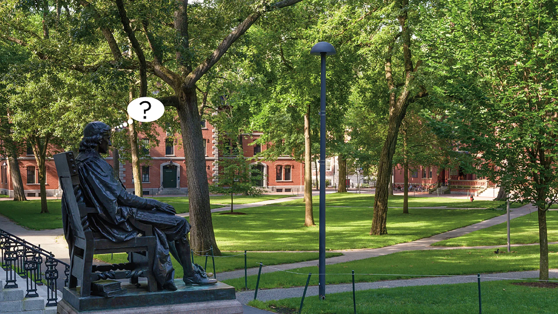 Photograph of John Harvard statue, Harvard Yard, with cartoon balloon question mark, about uncertainties surrounding the fall semester