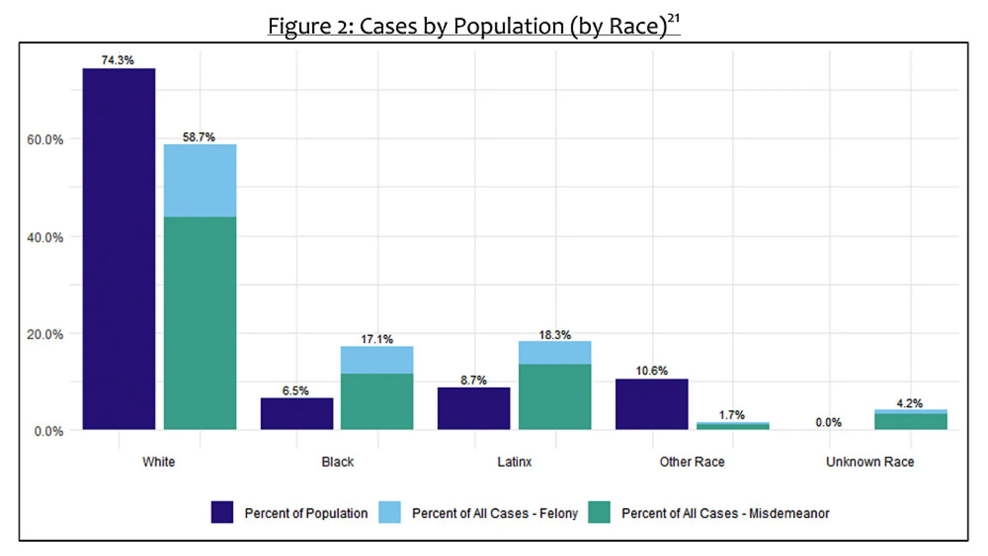 • Black and Latinx people charged with crimes carrying mandatory minimum sentences are substantially more likely to be incarcerated and receive longer sentences than whites facing charges that carry mandatory minimum sentences.