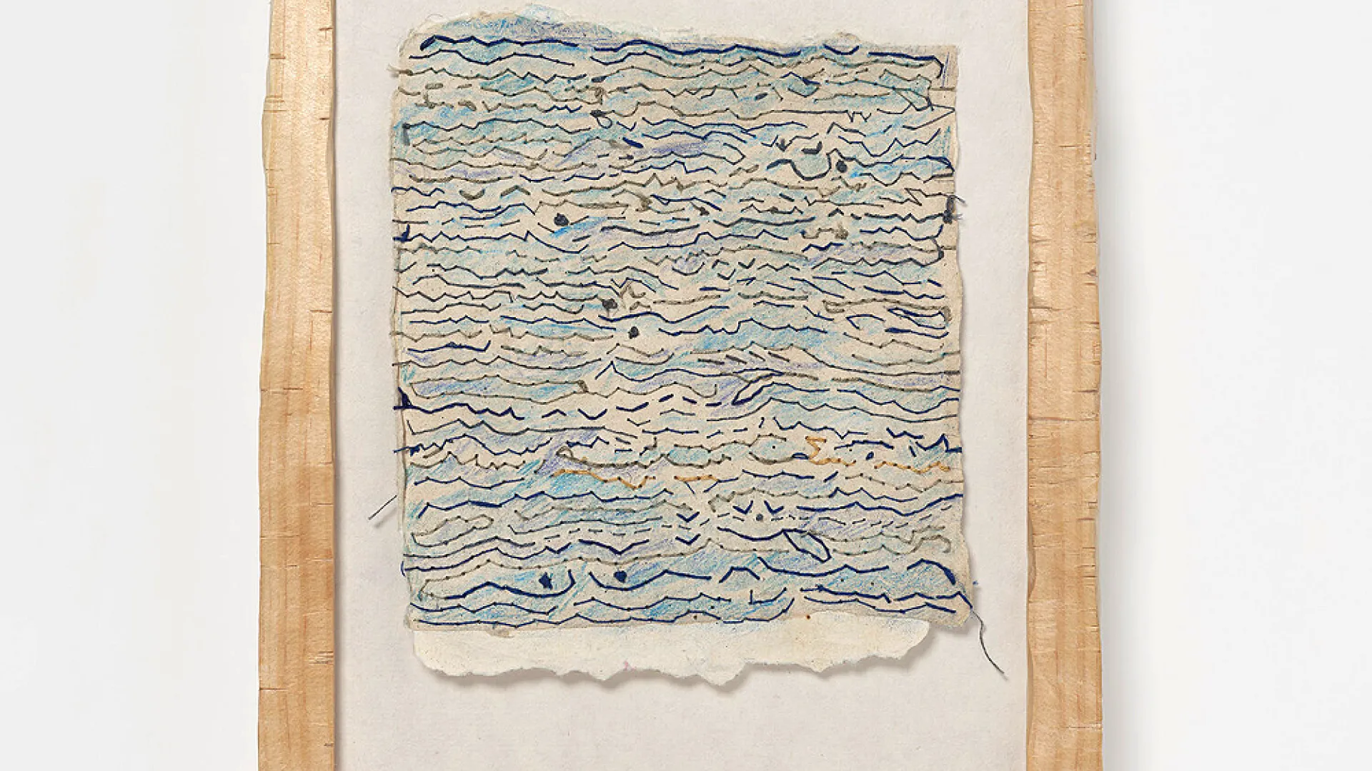 Among the works on display is the one from which the exhibit draws its title: Accompanied: Two Views of the Sea, an image on paper—with colored pencil and cotton thread mimicking ocean waves—encircled by a pine and gouache frame. The image is Pappas’s, inspired by a week in Provincetown several years ago; the frame is Slosburg-Ackerman’s. “When I saw that piece of Marilyn’s,” she said, “I loved it, and I wanted to make a frame.…Some people have asked, can we collaborate? No, we don’t. But I think of that frame as a hug and a response.”