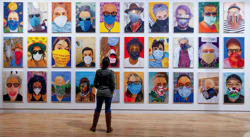In the early days of the COVID-19 pandemic in the United States, amid spreading fears and sheltered isolation, Los Angeles artist Richard Nielsen painted a colorful portrait of himself in a mask. Soon, he was painting friends and family members in their masks, by way of cell-phone-snapped selfies they sent to him. When he texted a few portraits to his friend Denise Markonish, MASS MoCA’s senior curator and director of exhibitions, she also sent back a mask-wearing selfie, which he turned into a painting, too. Their two circles of friends and colleagues soon became part of a growing community of Nielsen-painted portraits, 49 of them now on display in “This is Not a Gag,” at the North Adams museum through 2021. “Working with Richard created a shared experience and conversation, a collective, especially as we each were having our own private experiences,” says Markonish, whose masked face is among those exhibited. “When everything seemed so uncertain, this was an incredible, playful thing to do. It brightened things.”