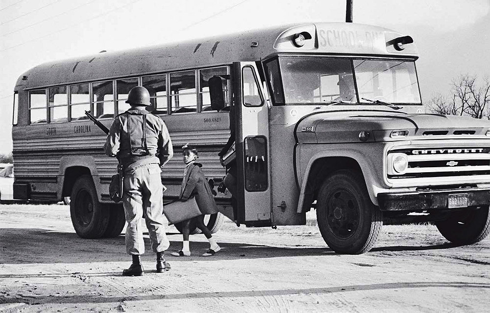 School desegregation: National Guardsman meeting bus at Lamar School, defending against South Carolina anti-integration protests (1970)