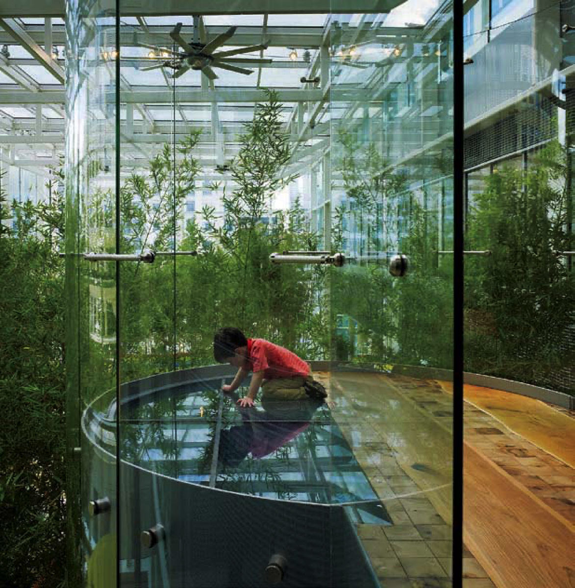 For Kim, the idea of “restorative landscapes” refers to both the ecological and the human: much of her work focuses on vulnerable populations. One of the best known is the Crown Sky Garden at Lurie Children’s Hospital, a glass-enclosed box of light and color perched on the eleventh-floor terrace of a medical center in downtown Chicago. It offers an escape from the hospital for young patients and their families, a place where leaves rustle, and they can touch things and move freely. There are groves of bamboo trees and wooden benches that electronically emit birdsong and rain sounds. A resin wall of blues, greens, yellows, and purples curls through the room like a wave; whenever a child steps toward it, a virtual image of waves and bubbling water appears, intensifying as one comes closer. (The wall’s interactivity, Kim says, is intended to restore a measure of control to young patients whose lives are often defined by a lack of it.) High in one corner of the garden, a clear-walled “treehouse” enables the sickest children to take in the scene from above, separate but still connected.