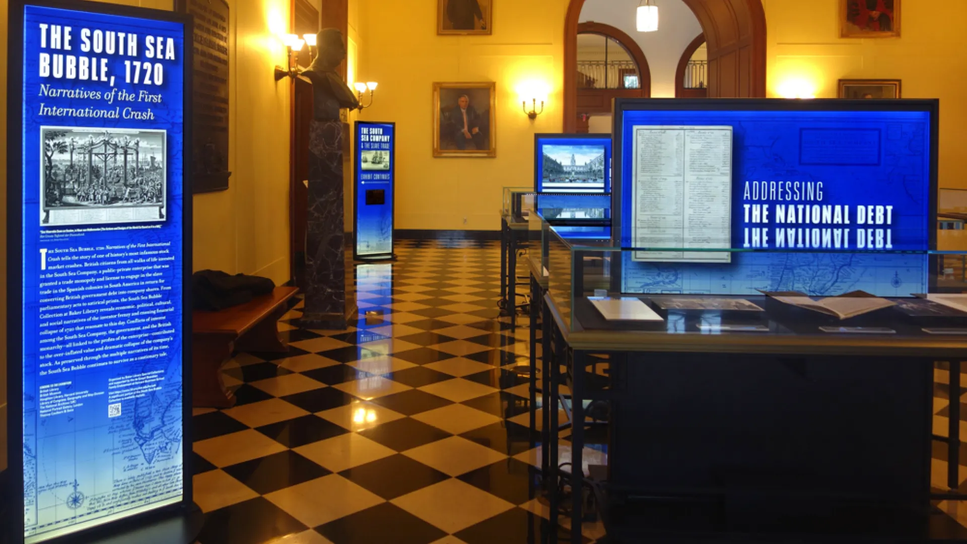 In the north lobby of Harvard Business School’s Baker Library, beneath portraits of deans dating back to the school’s founding, glass cases adorned by glowing sky-blue signs capture the curiosity of passersby and disrupt the flow of foot traffic. “Addressing the National Debt,” “Marketing & Financial Transactions,” “Debt Acquisition Scheme,” and “The Crash,” the signs display. Within the cases are dozens of materials drawn from the Bancroft Collection, donated to the library in 1935: satirical prints, parliamentary acts, correspondences between brokers and investors, books, broadsides, and ballads. Collectively, they tell the story of the 1720 collapse of the South Sea Bubble, one of history’s earliest and most significant international financial crises. “British citizens from all walks of life invested in the South Sea Company,” the exhibit’s opening plaque reads. “As preserved through the multiple narratives of its time, the South Sea Bubble continues to survive as a cautionary tale.”