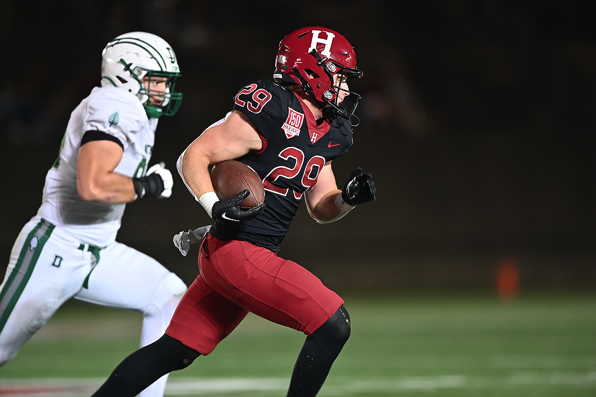 Harvard’s game against Dartmouth on Saturday evening was in keeping with the throwback nature of this season’s celebration of 150 years of Crimson football. There was the big Harvard Stadium Homecoming crowd, reminiscent of Harvard-Dartmouth games of yore. There was the tight defensive struggle. And there was the almost complete reliance on the ground game, which harked back to the days before the legalization of the forward pass. The upshot was a 17-9 victory for the Crimson (who entered ranked No. 23 in the Football Championship Subdivision) that pushed Harvard’s record to 6-1 overall and 3-1 in the Ivy League, tied for first place with Princeton. The Big Green dropped to 3-4, 2-2.