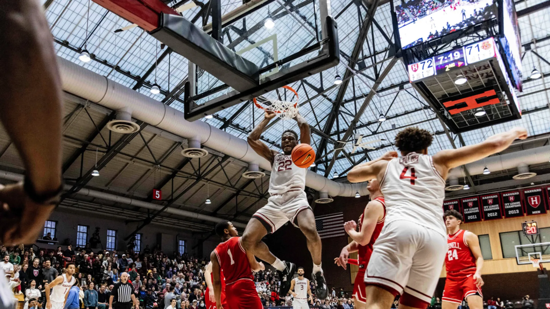 Last December, with just under four minutes remaining in the second half, the Harvard men’s basketball team trailed fourth-ranked Kansas by just nine points when Jayhawks guard Bobby Pettiford exploded toward the hoop. Crimson forward Justice Ajogbor ’24 slid over and leapt to deter Pettiford, who passed to teammate KJ Adams Jr. Adams appeared to have an open dunk, until Ajogbor turned and jumped again to block him. Instead, it was Harvard’s Chris Ledlum ’23 who ended up with a basket, rushing down the court for a fast-break layup off Ajogbor’s block.