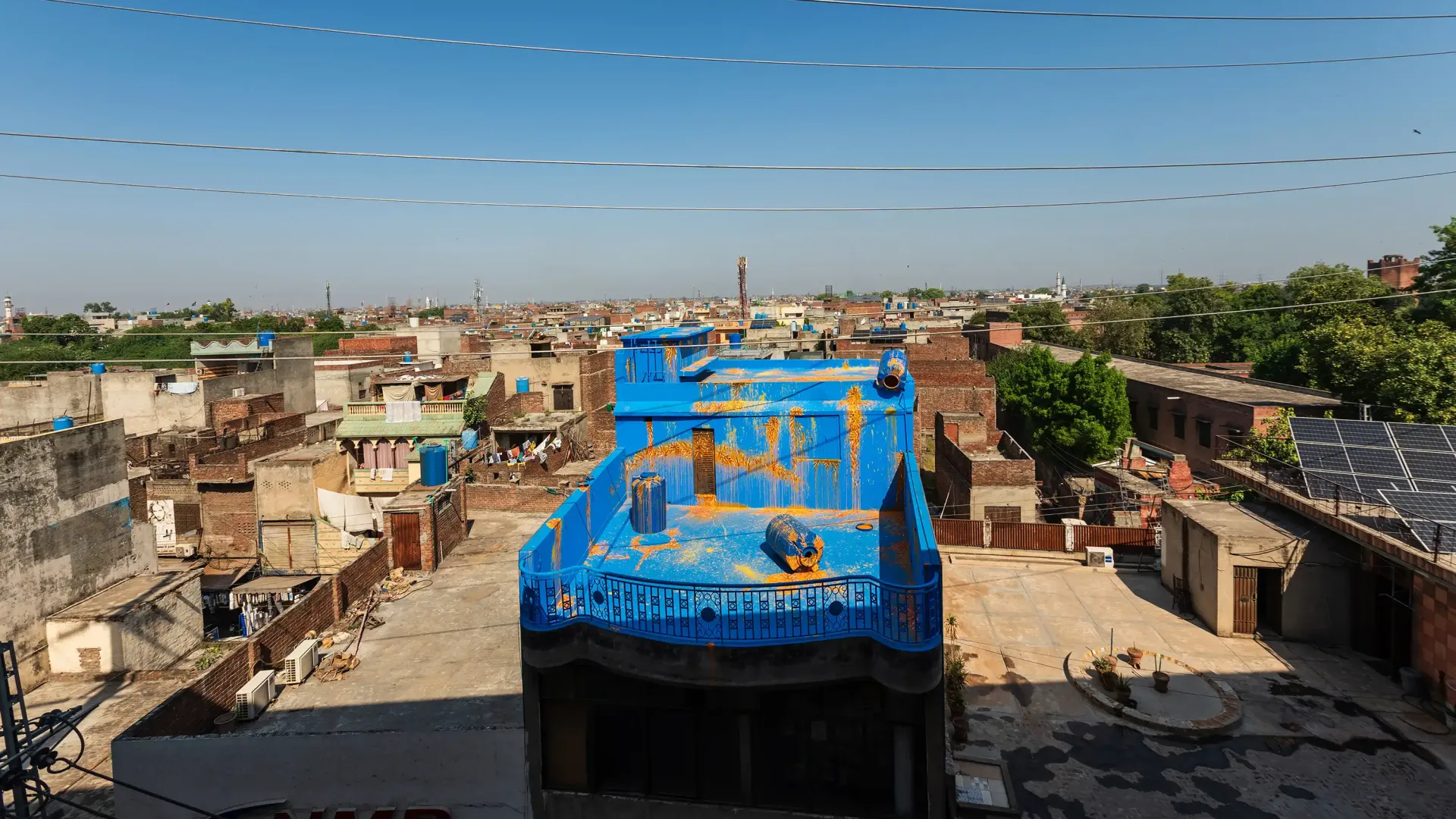 One artwork in this year’s show deals with more recent climate adaptations. Because water is delivered only at certain times of day in Lahore, many residents rely on backup, rooftop water tanks. For the biennale, the Pakistani artist Imran Qureshi painted some of those blue tanks with orange splatters and floral patterns. He then photographed the tanks, zooming in to emphasize the intricate patterns. Qureshi used these photographs to create two public art installations: a tile frieze in an underground pedestrian pathway; and a window installation at Shalimar Gardens Station. He also placed some of the painted tanks on a rooftop visible from the station platform. The water tanks “are a part of everyday life that people just ignore and don’t see,” Tain says. With this artwork, viewers are encouraged to engage with their environment, to “see and notice what it is that enables their everyday [lives].”